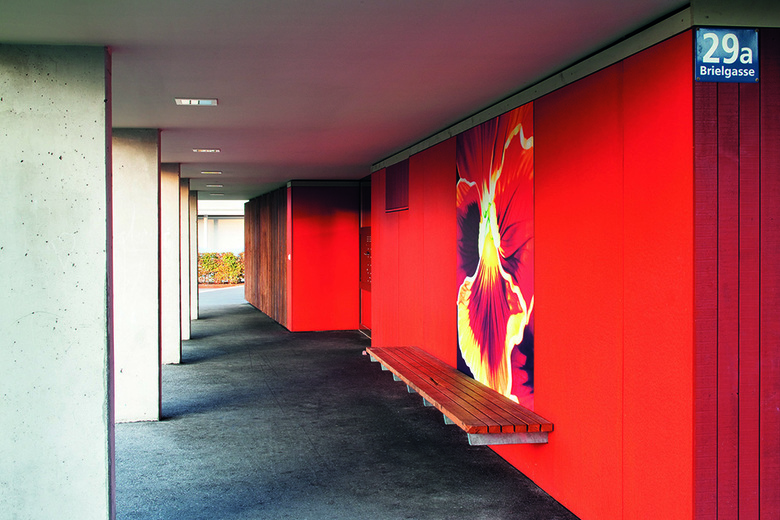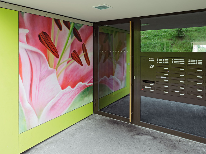 Auf dem Gelände der Wohnanlage befand sich früher eine Gärtnerei. Davon erzählen die Blumenmotive typischer Gartenblumen, die von der Künstlerin Brigitte Menschhorn gestaltet wurden. Vergrößerungen der Ölgemälde auf etwa 2 × 2m vermitteln die Lebensfreude der Natur und den Ausdruck an Farbe und Form in der Diszipliniertheit des sozialen Wohnbaus.