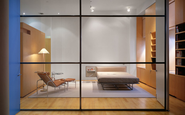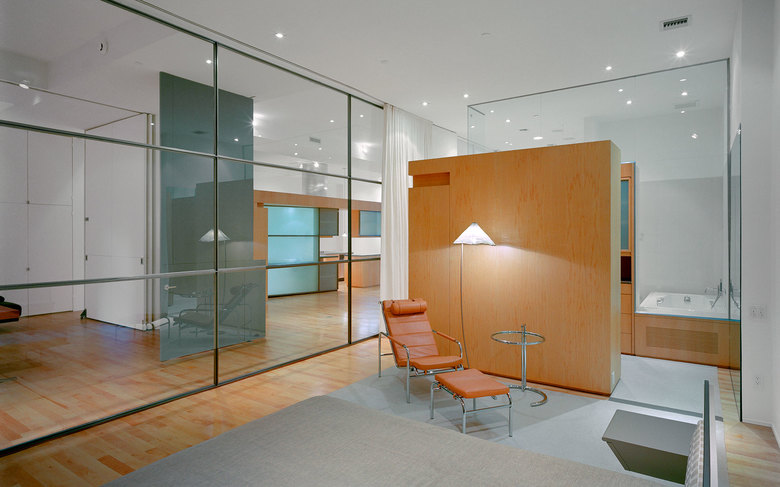 The steel and glass wall divides the master bedroom and bath from the rest of the apartment. Curtains telescope in and out from two bays in the center of this wall where sandblasted glass panels give privacy to the bath. The curtain allows the inhabitant to control the openness of the space.