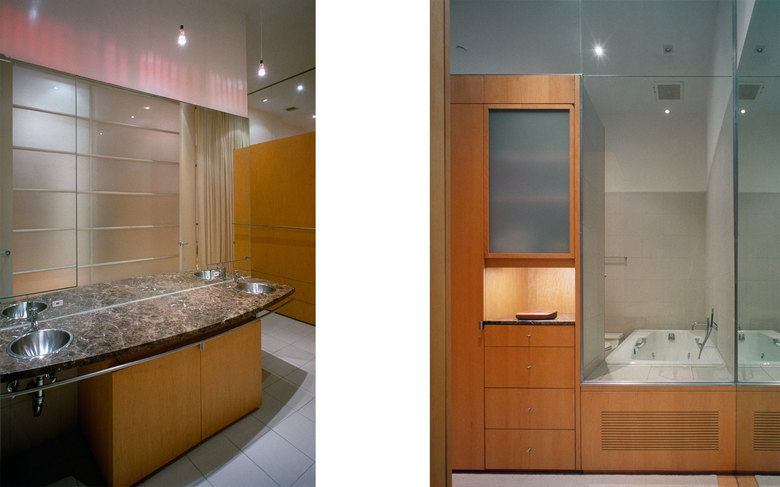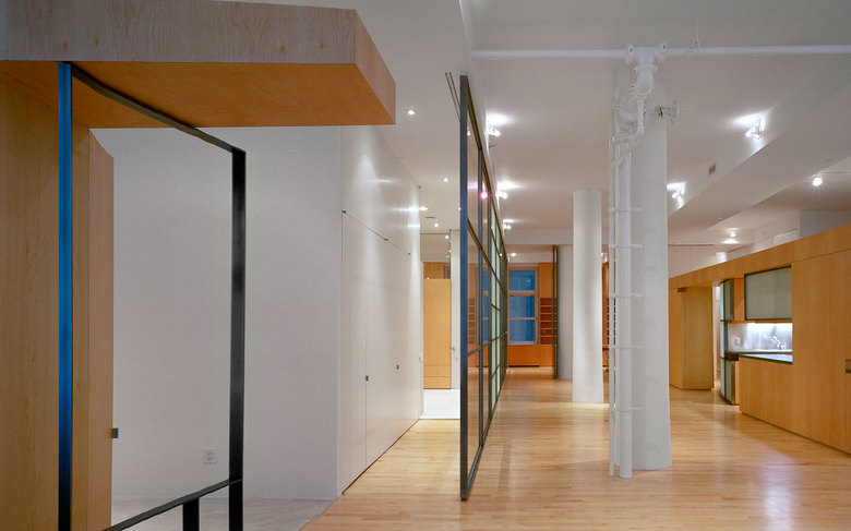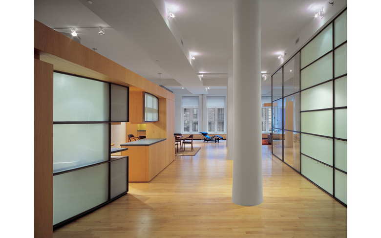 This project is an adaptation of a 3,800 square foot industrial loft space into a residence. The space is on the second floor of a loft building in lower Manhattan. The design evolved from explorations of ambiguities between public and private by means of partial enclosures, transparent materials, and the character and uses of the space.