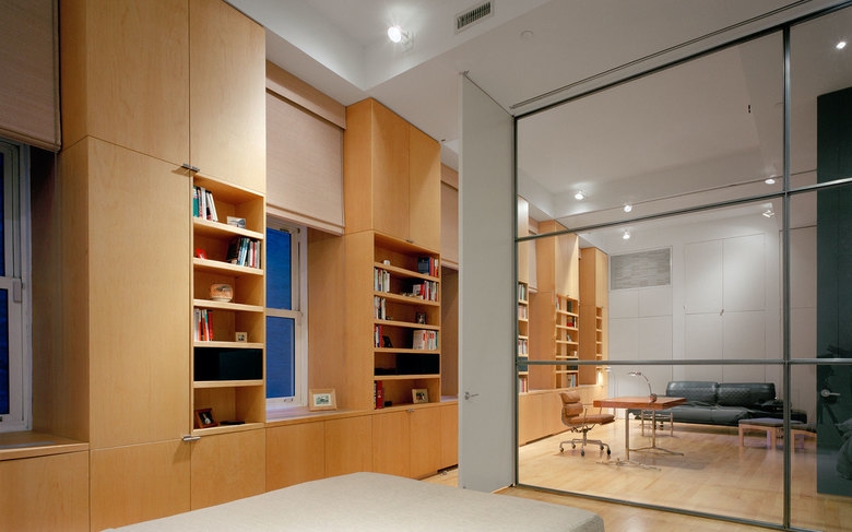 Full-height painted wood panels close down the rear of the apartment. Open, the panels float in the space; closed, they demarcate one room; closed further, two rooms. The disposition of the space depends on the desire of the inhabitant.