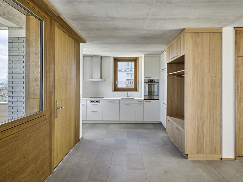 Die Gebäude sind in Massivbauweise mit selbsttragendem Sichtmauerwerk erstellt, wie es beispielsweise auch bei der Stadtbibliothek von Rüschlikon oder entlang der Bahngleise und in alten Villenvierteln in der weiteren Umgebung zu finden ist. Boden und Decke der Laubengänge sowie die Erschliessungstürme sind in Sichtbeton ausgeführt und werden in Form von Gesimsen um die Baukörper gezogen. Vorgefertigte Elemente aus Eichenholz strukturieren das Gebäude durch ihre repetitive Anwendung im ganzen Baukörper. Im Eingangsbereich erzeugt die Auskleidung mit Holzelementen und eingebauten