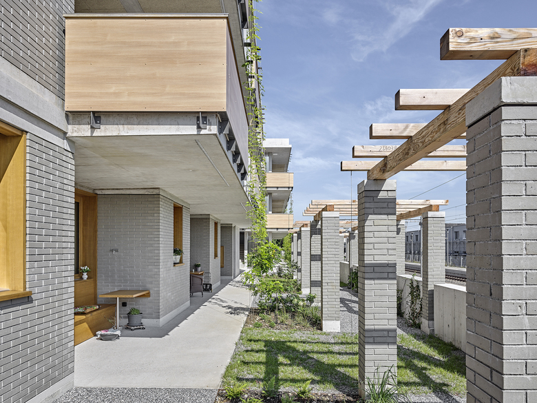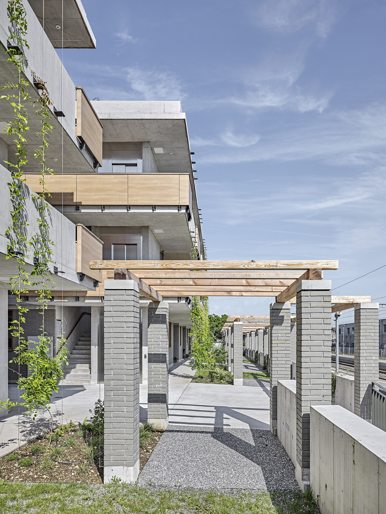 Die Wohnungen werden ostseitig über zwei zentrale Erschliessungstürme und den anschliessenden sozialisierten Laubengang erschlossen. Hier bilden Ausnehmungen im Baukörper jeweils Vorzonen für die Wohnungen. Die Möglichkeit diese zu personalisieren schafft individuelle Adressen statt einfacher Wohnungsnummern.