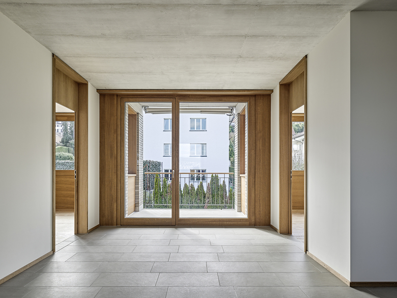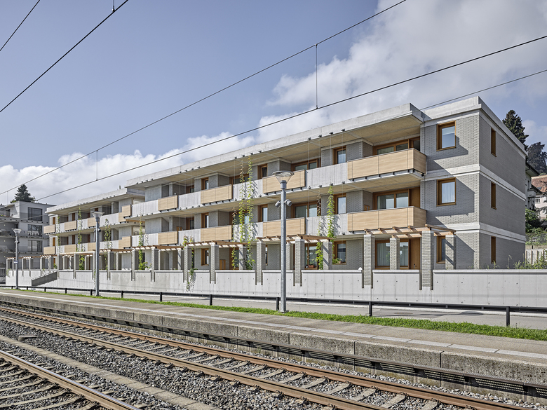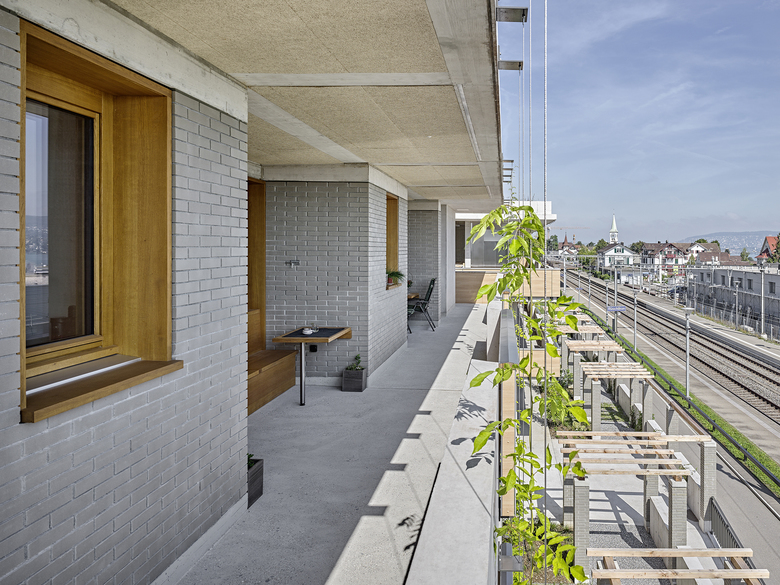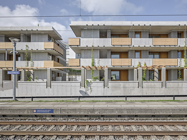 Direkt an der Bahnlinie in Rüschlikon nehmen zwei präzis gesetzte Baukörper die Linearität des Grundstücks auf und fügen sich zugleich in die offene Bebauungsstruktur der Nachbarschaft ein. Mit der Setzung der Gebäude entstehen zwei grosszügige Aussenräume, die durch ihre unterschiedlichen, hohen Aufenthaltsqualitäten überzeugen. Im Erdgeschoss bildet eine begrünte Pergola den Abschluss zur Bahnlinie und stellt den wichtigen Bezug zum Zürichsee her. Als Gegenpol zur öffentlichen Seeseite mit der Gebäudeerschliessung ist der Gartenhof ein Ort der Ruhe und des Zusammenseins. Die Privatsphäre der Erdgeschoss-Wohnungen gegenüber