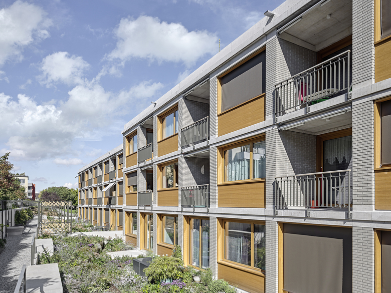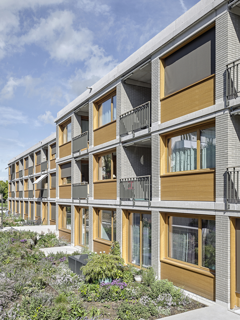 Bereichen einen kommunikativen Charakter und sollen eine Nachbarschaftsbildung fördern. Alle Wohnungen sind nach der Idee des Durchwohnens mit einer West-Ost Ausrichtung organisiert. Die Balkone sind in das Bauvolumen eingearbeitet und verlängern das Wohnzimmer. Alle Schlafzimmer sind in diese Richtung zum Gartenhof hin orientiert. Durch die Organisation der barrierefrei gestalteten Grundrisse ergeben sich gefasste Bereiche in den Wohnungen, die sich sehr wohnlich und altersgerecht