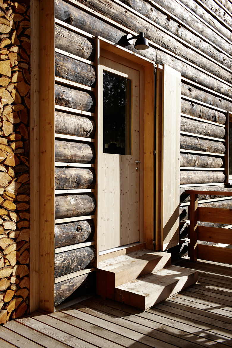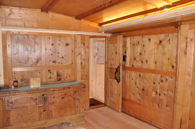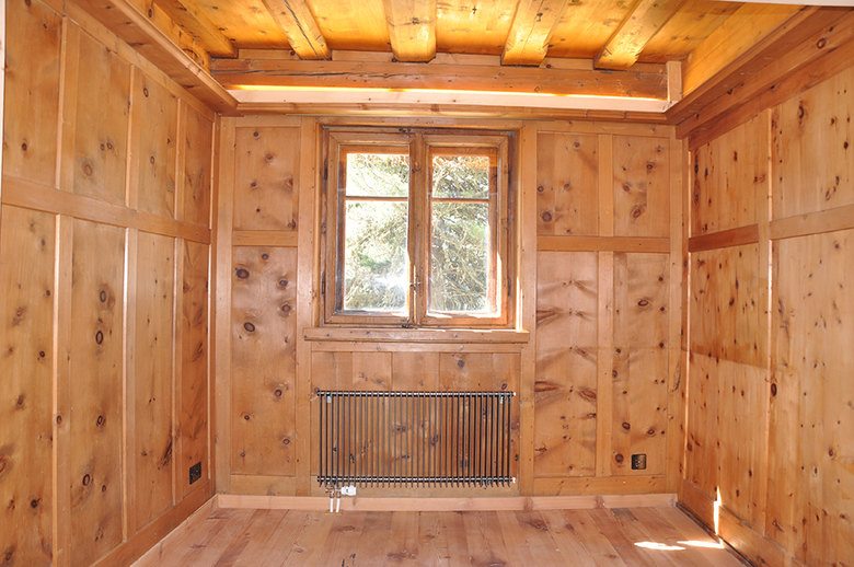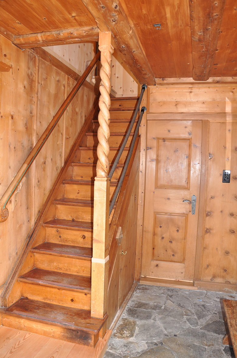 Auf den bestehenden, detailreichen Massivholz-Innenausbau (grösstenteils Arvenholz) wurde beim Ergänzen, Ersetzen und Anpassen grosse Rücksicht genommen. Die neuen Räume wurden in einer zeitgemässen, dem alpinen Kontext verbundenen Materialisierung ausgeführt. Als stilistisches Bindeglied figurierte da die gewölbte, schiffsbauartige Decke: im 1. OG ist sie in Holz und im 2. OG in Gips ausgeführt.