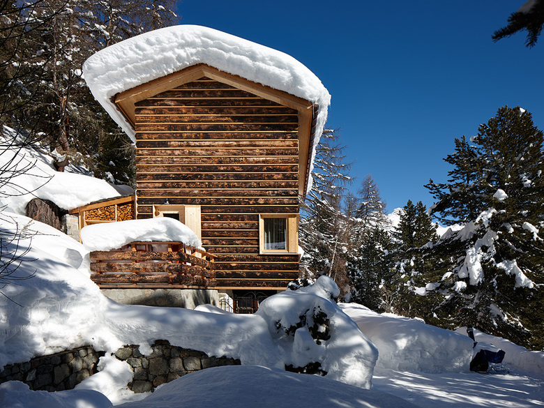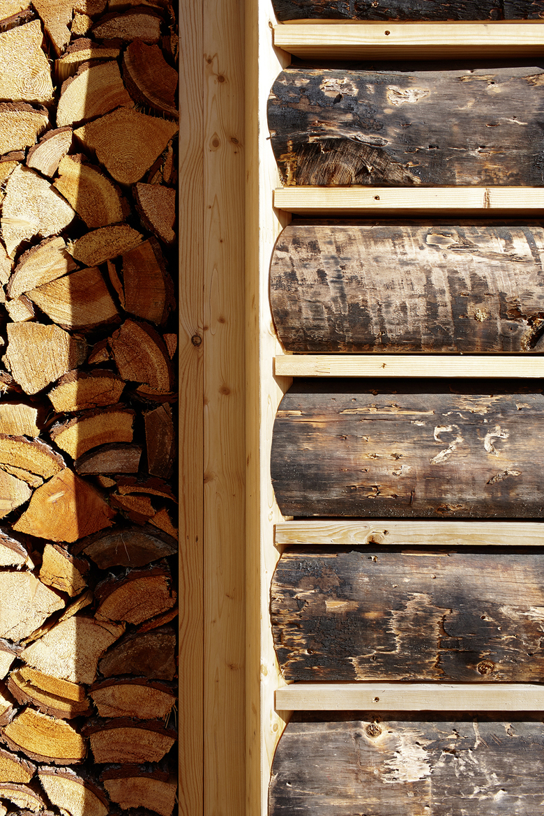 Die Fassade des Bruchstein-Sockelgeschosses mit den gebauchten Schmiedeisengittern bleibt durch den Umbau unverändert erhalten. Das erste und zweite Obergeschoss wird mit einer neuen, aus gebrannten Schwartenbrettern und gehobelten Leisten gefertigten Schale überstülpt und zu einer formalen Einheit gebunden. Die Anleihen an Material und Ausdruck an den Altbau werden auf diese Art subtil transformiert.