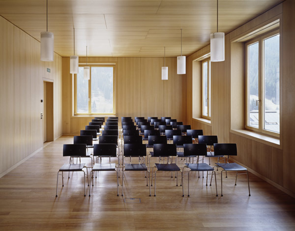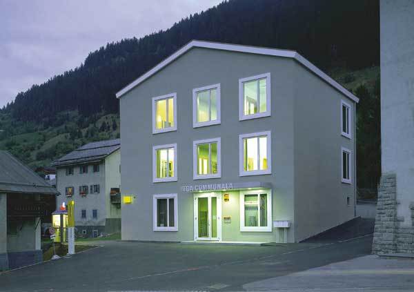 Im Kern von Tinizong haben sich die öffentlichen Bauten versammelt, die das dörfliche Leben bestimmen: Schule, Kirche, Gemeindehaus. Als unabhängige Solitäre stehen sie mit engen Zwischenräumen an der Hauptstrasse. Das neue Gemeindehaus nimmt diese Form auf, weicht aber ein wenig von der Strasse zurück, um so Raum für einen Vorplatz zu schaffen. Die zurückversetzte Position erlaubt es, die Fassade mit mehr Distanz zu betrachten. In den Dörfern des Oberhalbstein ist eine dreigeschossige Fassade mit neun Lochfenstern unter einem Giebeldach ein häufiger architektonischer Topos. Die üblichen Bauvolumen und die traditionelle Ausbildung der Öffnungen haben zu dieser Regel geführt. Auch das neue Gemeindehaus folgt dem alten Muster. Nur sind hier die Fenster nicht symmetrisch unter dem Giebel angeordnet, sondern leicht zur Seite gerückt. Diese Verfremdung und die grossen Formate verankern den Bau in der Gegenwart. Ein knapp beschnittener Dachrand, der fehlende Sockel und die breiten, aussen angeschlagenen Fensterrahmen sind weitere Neuerungen gegenüber der Tradition. Auch die innere Aufteilung folgt der lokalen Typologie. Ein breiter Mittelgang erschliesst beidseitig die Räume. Sichtbeton, ein rötlicher Terrazzobelag und massive Eichenholztüren geben dieser Zone einen repräsentativen und halböffentlichen Charakter. Hinter diesen Türen reihen sich die Post, eine Bankfiliale, die Gemeindekanzlei, das Büro des Försters und weitere Einrichtungen der Gemeinde auf. Wie an einer Dorfstrasse lassen sich so die verschiedenen Geschäfte erledigen, und der Gang wird zum Treffpunkt. Das Ziel des Weges bildet im obersten Geschoss der Gemeindesaal, der in der Art einer Ratsstube ganz in Eichenholz getäfert ist. Von hier fällt der Blick weit über die Dächer des Dorfes hinweg auf das Tal und den Piz Toissa.