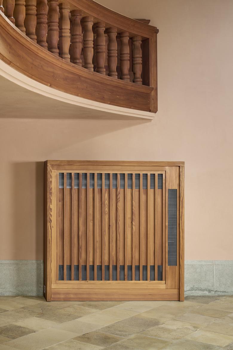 Die sich den Wandflächen entlang ziehenden Heizkörper aus den Sechzigerjahren verstellten den Mauersockel und verunklärten den Raum; auch waren sie verantwortlich für unschöne grauen Verfärbungen an den Wänden. Eine erste Idee bestand darin, die Radiatoren durch Konvektoren in Form von Rippenrohren zu ersetzen. Dann stiessen wir bei unseren Recherchen auf Planskizzen Hartmanns, die in den Fensterachsen Heizkörperverkleidungen ausweisen. Dies brachte uns dazu, neue multifunktionale Holzkästen zu entwerfen, welche die Heizung, die Elektroinstallationen und die Lautsprecher an insgesamt vier Orten konzentrieren. Um die Raumwirkung dieser prägnanten «Möbel» auszuloten, erstellten wir 1:1-Modelle mit verschiedenen Holzmustern. Bei der plastischen Umsetzung wurde den Details der einzelnen Holzverbindungen und somit dem Bauhandwerk grosse Aufmerksamkeit geschenkt.