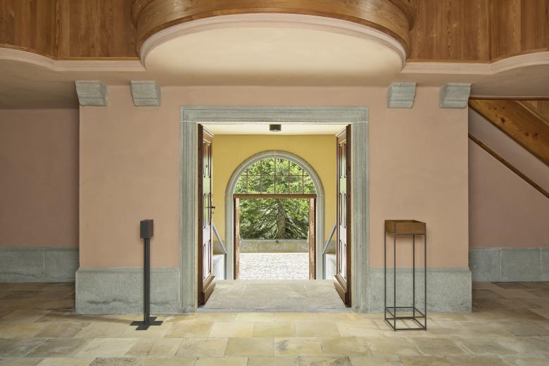 Die ursprüngliche Farbigkeit der Decke im Vorraum liess sich nicht eindeutig ermitteln. Der fehlende Befund zwang zu einem gestalterischen Entscheid. Wir beschlossen, den lichten Ockerton der Wände auch auf die Decke zu übertragen und den kleinen Vorraum so als leuchtende Box zu inszenieren. Die spannende räumliche Abfolge vom engen Vorraum zu dem etwas erhöhten und grosszügigen Andachtsraum erfährt durch die differenzierte Farbgebung eine zusätzliche Stärkung.