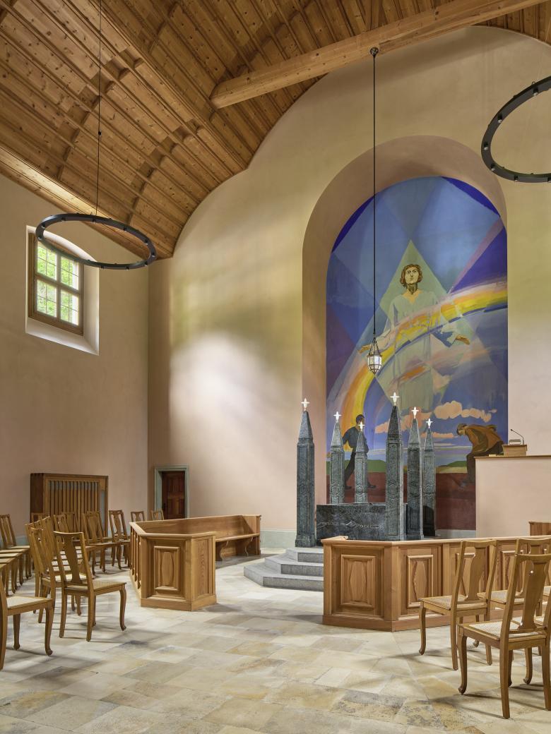 Die Bauherrschaft liess sich überzeugen, die nachträglichen Dispersions-Anstriche mit einem biologisch abbaubaren Abbeizmittel entfernen zu lassen und den Neuanstrich wieder mit einer atmungsaktiven, lebendigen Kalk-Kaseinfarbe in den Originalfarben auszuführen. Der Neuanstrich sollte leicht und etwas wolkig wirken und eine optische Tiefe aufweisen. Kalkfarbe lässt als einziges Anstrichmittel das Licht tief in die Farbschichten dringen, was den Farbton samtig weich erscheinen lässt. So erstrahlt der Andachtsraum heute wieder in hell-ziegelroten Farbtönen unterschiedlicher Schattierungen: die Nischen von Orgel- und Wandbild sind dunkler und die Fensterlaibungen wiederum heller als die Wände.