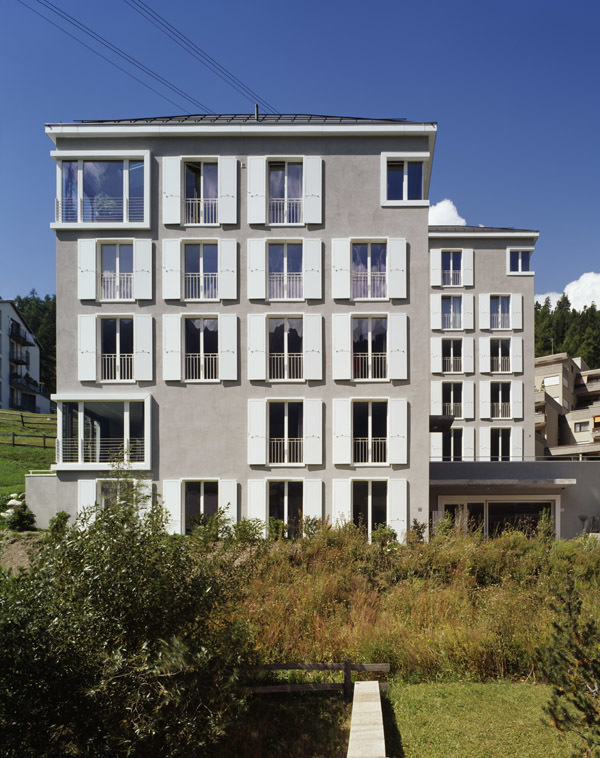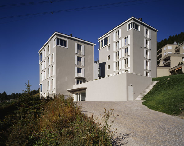 Die beiden turmartigen Wohnhäuser stehen leicht versetzt zueinander, so dass sie sich gegenseitig weder in der Sonne stehen noch die Aussicht nehmen. Französische Fenster mit weissen Metallzargen und Aluminiumläden geben den Häusern zusammen mit dem warmgrauen Fassadenverputz eine zurückhaltende Ausstrahlung. Von einem Rückgriff auf Tradition und Geschichte zeugen auch die akzentuierten grossformatigen Panoramafenster an den Gebäudeecken. Es ist eine zeitgemässe Transformation des „balcun tort“, des falschen Balkons, in die heutige Architektursprache.