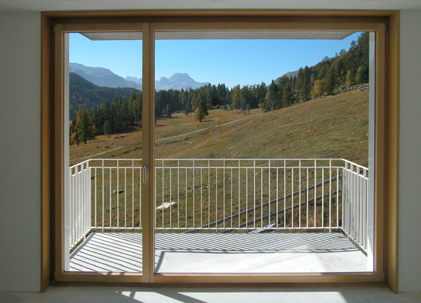 Die unterschiedlichen Etagenwohnungen nehmen jeweils ein ganzes Geschoss ein und orientieren sich nach allen vier Himmelsrichtungen. So bietet sich aus jeder die uneingeschränkte Aussicht auf Dorf und See, die französische Kirche und die Margna.