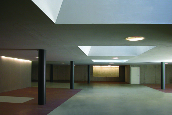 Man betritt die Anlage über die im verbindenden Sockelgeschoss liegende Einstellhalle; diese wird so gleichzeitig zum grosszügigen Foyer. Trichterförmige Oberlichter streuen Tageslicht in die Eingangshalle, während an den Wänden künstlich belichtete Schaufenster wie Laternen die Parkfelder erhellen.