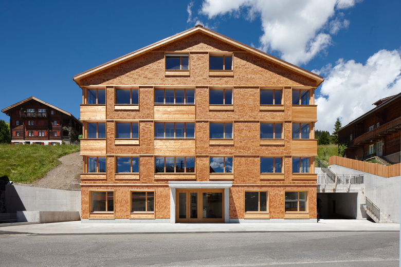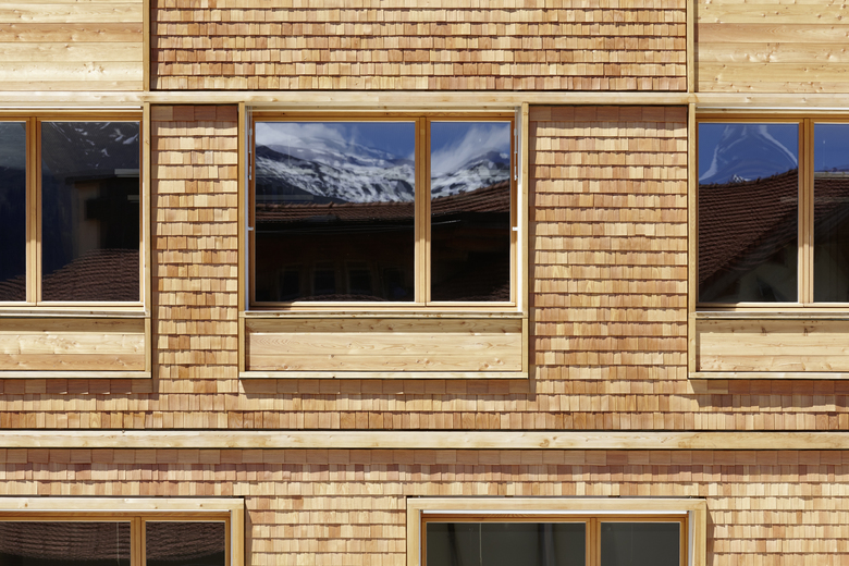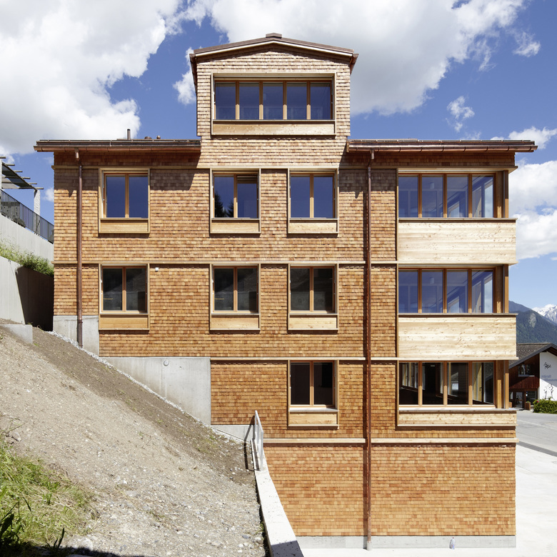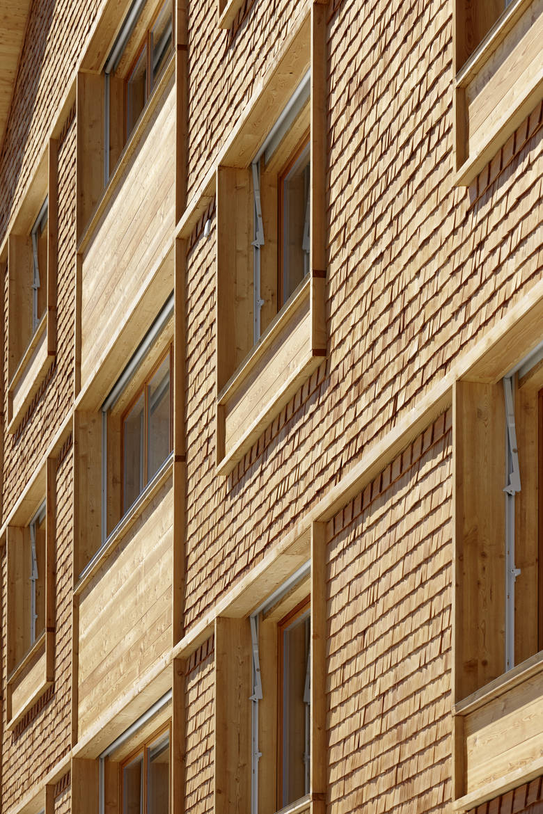 Über den Massivkern ist ein reiner Holzbau mit Giebel, Vordach und Lukarnen gestülpt. Die formale Ausbildung ist regionalistisch geprägt, aber neu interpretiert. So dokumentieren handgespaltene Lärchenschindeln den ländlichen Kontext, während die akzentuierenden Holzfelder und die umlaufenden Lisenen das Haus in der Gegenwart verankern und dem Bau eine angemessene Repräsentanz verleihen.