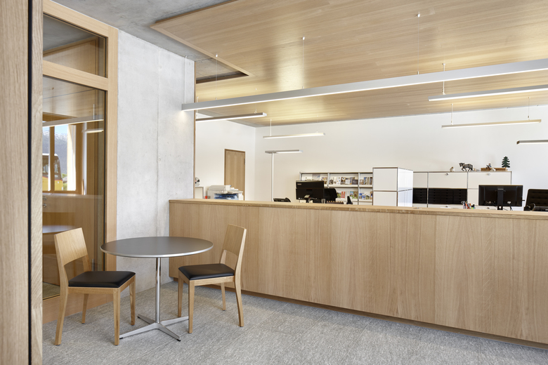 Was nach aussen als einheitlicher Baukörper erscheint, entpuppt sich im Innern als hybrid genutztes, multifunktionales Gebäude. Hier wird gearbeitet, gepflegt, geparkt, beraten, verhandelt und gewohnt.