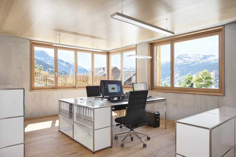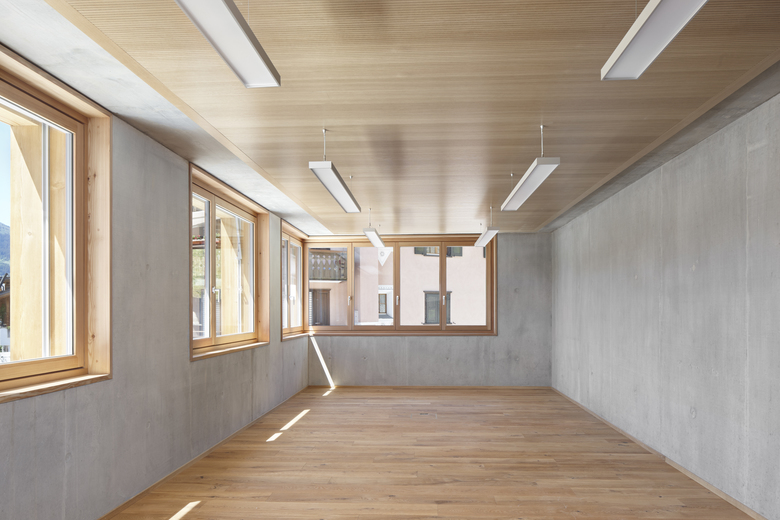 Alle Nutzer betreten das Haus durch denselben Eingang. Die Eingangshalle erfüllt verschiedene Funktionen. Zum einen trennt sie den privaten Eingangsbereich von der öffentlichen Nutzung, zum anderen führt sie gerade auch Bewohner und Besucher zusammen. Im EG teilen sich die Gemeindeverwaltung und die Pany/Luzein-Tourismus-Beratungsstelle ein Grossraumbüro. Im 1. OG steht den Hausbewohnern und auch Aussenstehenden ein Spitex-Behandlungsraum zur Verfügung. Der grosszügige Sitzungsraum und das Büro des Gemeindekanzlisten und -präsidenten sind ebenfalls hier angeordnet.