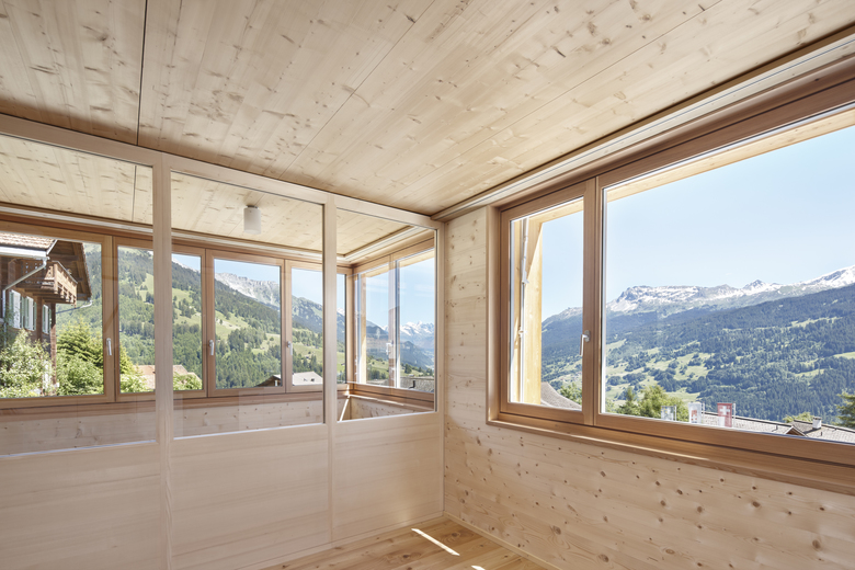 Die modernen Raum- und Lichtbedürfnisse verlangen nach grosszügigen Grundrissen und Fenstern. Mit der Veranda hat jede Wohnung einen lokaltypischen Innenraum, der der privaten Stube vorgelagert ist und so den Wohnraum erweitert. Sie bietet eine grandiose Sicht in die Berge und auf den belebten Platz vor dem Haus.