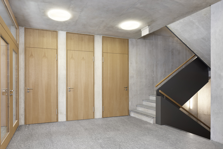 Der Erschliessungskern, ganz in Sichtbeton und Naturstein gehalten, fungiert als Mittelkorridor und erinnert in Anlage und Materialisierung an Beispiele lokaler Baukultur, wie z.B. das Sprecher-Haus in Luzein.