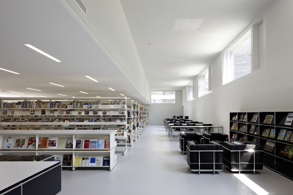 Der grosse stützenfreie Raum der Mediothek, wird mittels einer Differenzierung der Raumhöhe, in einzelne Bereiche gegliedert: den hohen und von hochliegenden Fenstern indirekt ausgeleuchteten Arbeitsbereich für die Studenten, den niedriger gehaltenen Standort der Bücherregale und der Auslei-he mit direktem Landschaftsbezug. Die Fenster wirken von diesem Standpunkt als innenräumliches Ornament, das die naheliegende Churer Bergkette des Montalin zu einem Landschaftsfries zusammenfasst. Glatte weisse Wandoberflächen lassen im Innern die kubischen Raumformen hervortreten und reflektieren das Licht weit ins Innere. Diese weisse Auskleidung der Räume schafft hier wie auch im übrigen Gebäude eine lichtdurchflutete neutrale Atmosphäre für konzentriertes Arbeiten. Gleichzeitig finden in dieser weissen Innenschale die den heutigen Ansprüchen genügende Dämmung sowie die Hausinstallationen Platz, wodurch die einfache Form der Räume unterstützt wird.
