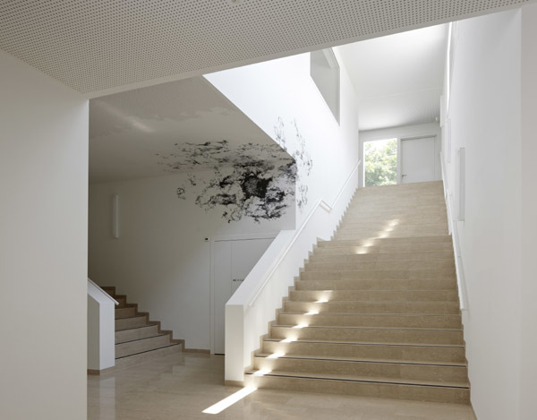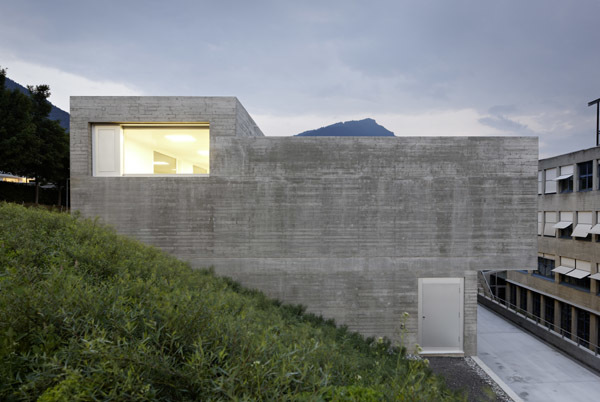 Auf der Ebene von kleinen Rücksprüngen in der Fassade und der Ausgestaltung der Fenster wird die plastische Bearbeitung des Baukörpers zusätzlich weitergeführt. Der Verzicht auf einen umlaufenden Blechdachrand und die fugenlose Ausführung des Baus unterstreichen den Eindruck eines plastisch geformten Monoliths.