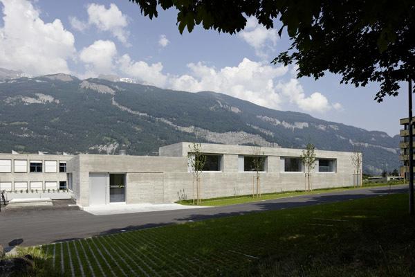 Zunächst klärt der Neubau den bislang undefinierten Abschluss des „Parkraums“ im Dreieck der Bestandsbauten und der Scalärastrasse. Die plastische Formung des Neubaus wird dazu benutzt, um von der parkseitig eingeschossigen, pavillonartigen Anmutung zu einem zwei- bzw. dreigeschossigen Körper gegenüber dem hoch aufragenden Schulgebäude überzuleiten und den bislang fehlenden Übergang der Massstäbe herzustellen. Zwischen den Häusern entsteht ein hofartiger Innenraum, der als Pausenterrasse dient und die Spannung zwischen diesen Massstäben erlebbar macht.