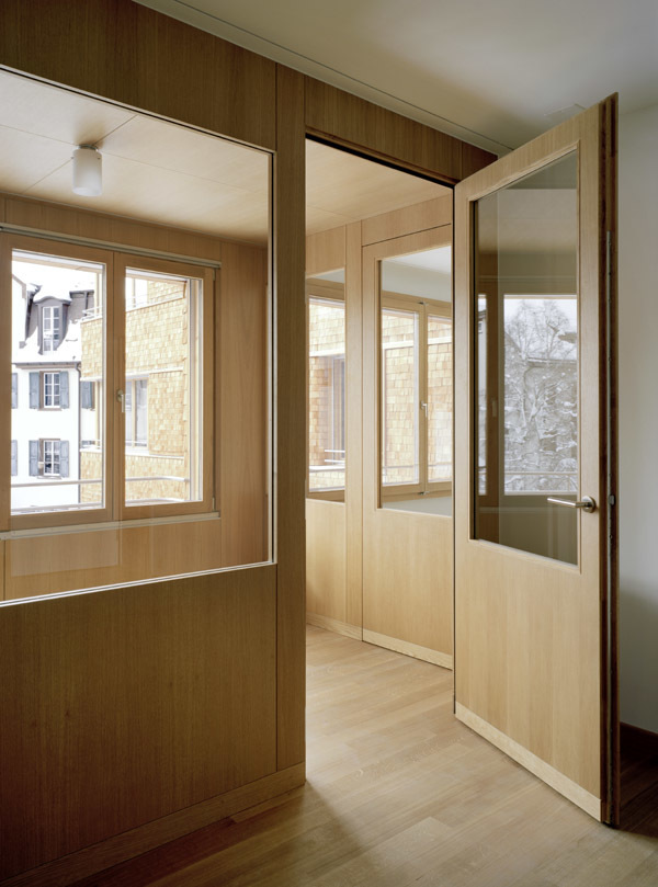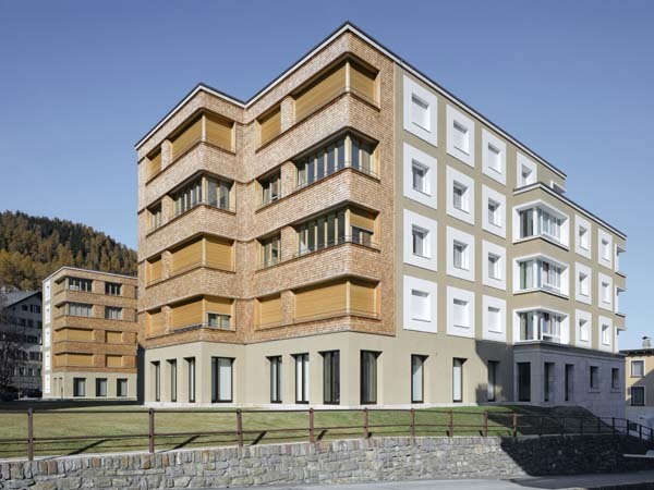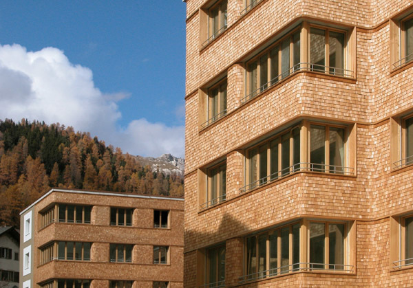 Vermittelt die Fassade zur Via dal Bagn einen steinernen Ausdruck, so schwingt sich um die Hoffassade eine Verkleidung aus Engadiner Lärchenschindeln. Der Kontrast zwischen der Strassen- und der Hofseite thematisiert die divergierenden Qualitäten des Quartiers: städtisch steinern zum einen, ländlich alpin zum andern. Holzfriese strukturieren die Schindelfassade in der Horizontalen und verleihen ihr ein dynamisches Erscheinungsbild. Das in der Abendsonne schimmernde Schindelkleid erzeugt im Hof eine angenehme Wärme und reagiert auf diese »weichere« Seite mit angemessener Geste.