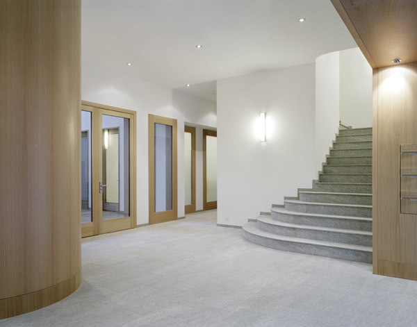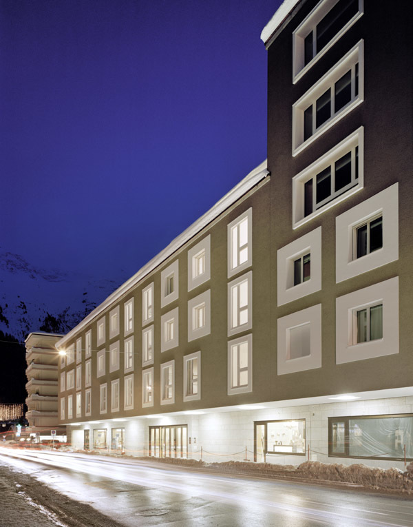 Die skulpturale Modellierung des Baukörpers lässt die Überbauung trotz ihres Ausmasses elegant und räumlich spannungsvoll in Erscheinung treten. Der Bau erinnert an die um die Jahrhundertwende im Bündner Stil errichteten Grandhotels wie La Margna oder das Suvretta Haus. Während die Arkade über dem Erdgeschoss als städtebauliches Element den Strassenraum in der Horizontalen definiert, signalisiert die volumetrische Überhöhung am hinteren Teil der Überbauung den vertikalen Abschluss der Anlage und die architektonische Anbindung an die folgenden aufragenden Wohn- und Geschäftshäuser. Die Travertinverkleidung des Sockelgeschosses unterstützt diese Absicht.