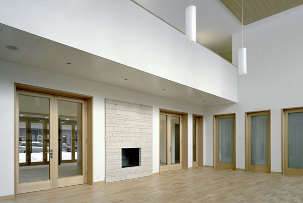 Die Materialwahl und die Farbgebung suchen ihren Ursprung in der regionalen Baukultur, nicht jedoch ohne den Anspruch der Transformation tradierter Elemente in die Neuzeit. Das Sockelgeschoss ist mit Travertin verkleidet. Die Dachrandausbildung, ebenfalls in Stein gehalten, zitiert die Dachabschlüsse der klassizistisch anmutenden Häuser, die nach den Bränden in Zernez und Lavin entstanden sind, so dass insgesamt eine sehr städtische Wahrnehmung erreicht wird.