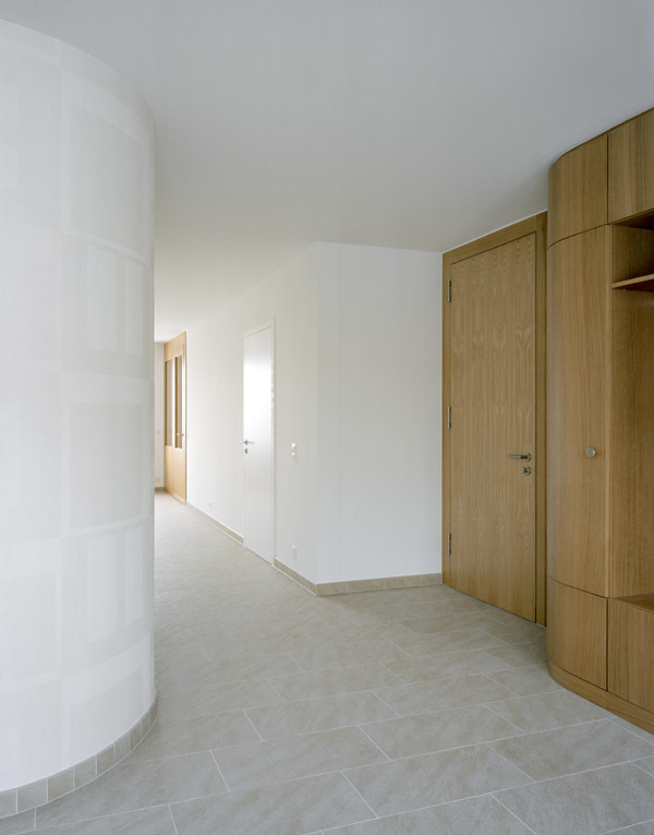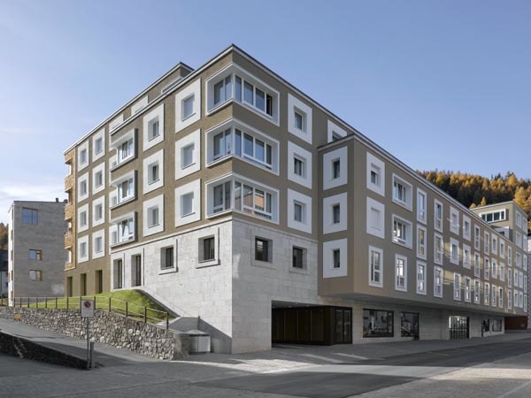 In Anlehnung an die in Besenwurf-Technik aufgetragenen Putze der Bündnerstil-Häuser aus dem frühen 20. Jahrhundert zeichnet sich der Neubau durch seinen grobkörnigen Fassadenputz aus. Der dumpfe Erdton der Fassade kontrastiert mit den flächig weissen Fensterumrahmungen. Die architektonische Ausbildung der Fenster nimmt Anleihen an den Trichterfenstern alter Engadinerhäuser, reduziert sie jedoch auf eine abstrahierte und kubische Ornamentik. Die Fenster liegen in vorfabrizierten Gewändemodulen unterschiedlicher Leibungstiefen. Während die Zimmerfenster ähnlich den Trichterfenstern alter Engadiner Häuser tiefe Leibungen aufweisen, vermitteln die aussen angeschlagenen, fein strukturierten französischen Fenster einen städtischen Charakter. Von einem Rückgriff auf Tradition und Geschichte zeugen auch die akzentuierten grossformatigen Panoramafenster. Es ist eine zeitgemässe Transformation des »balcun tort« in die heutige Architektursprache.