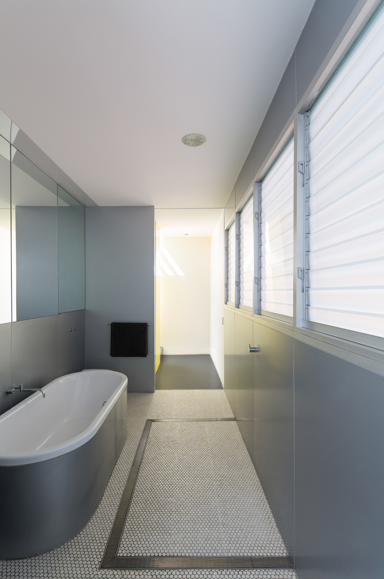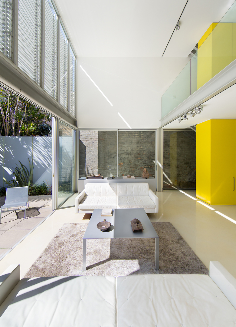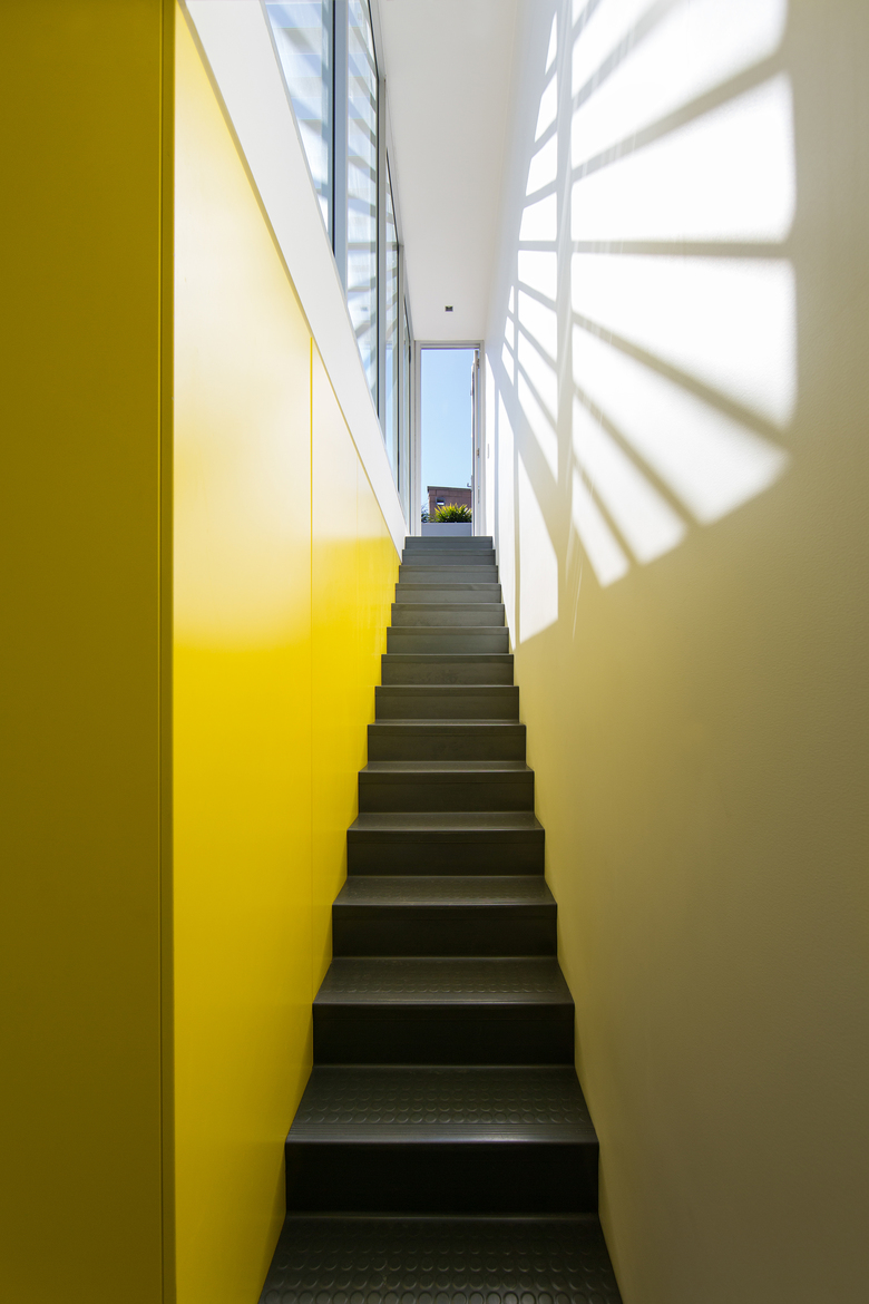 The bold two storey yellow joinery element, containing kitchen storage, integrated refrigerator and laundry on the lower level and wardrobe on the upper level, links the levels both physically and visually and is offset against a neutral palette of white walls and ceilings, silver anodised aluminium, grey rubber and white epoxy flooring.