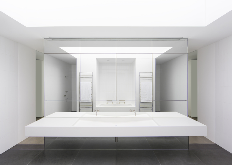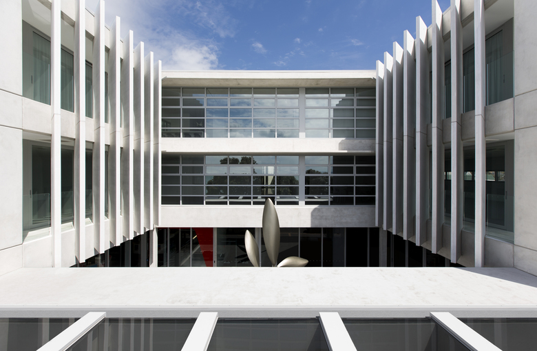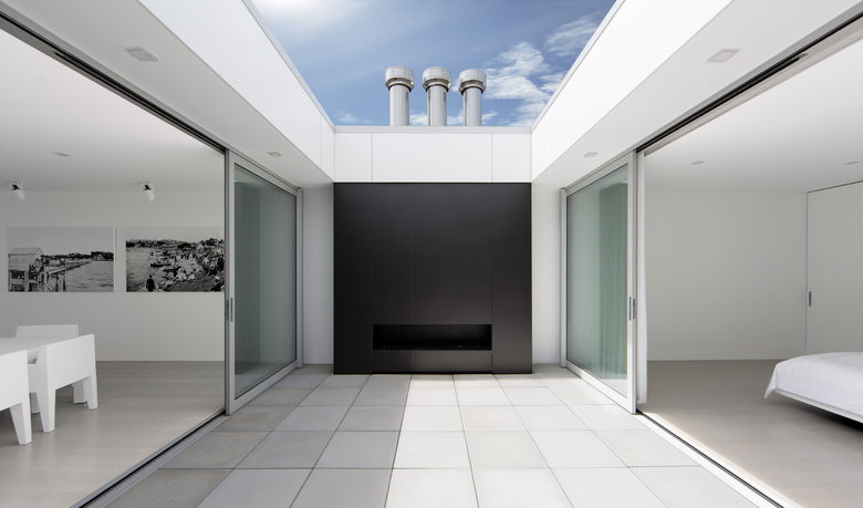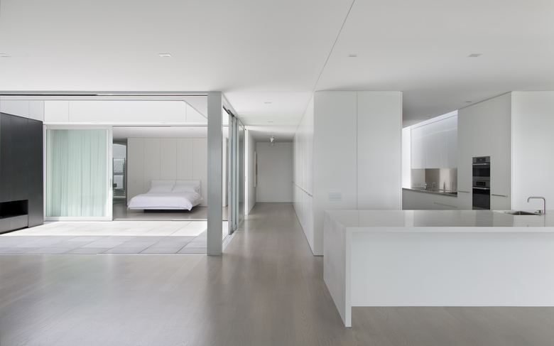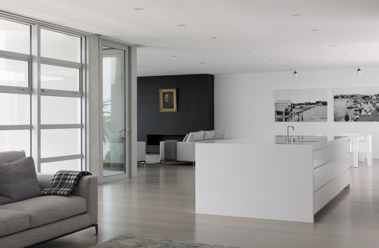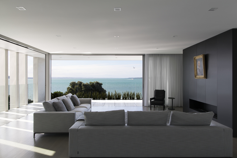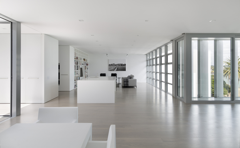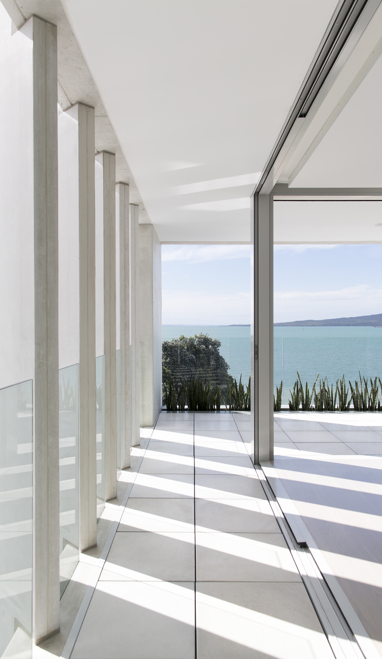 The building is constructed entirely of off-white precast concrete panels, with hollow core precast floor panels. The concrete is left exposed to all external faces and internally to all common areas. Angled off-white glass reinforced concrete blades are employed on the east and west faces of the public courtyard for privacy and sun-shading, while maintaining views out to the water. The concrete is complimented by a simple palette of materials to the internal spaces. Honed Basalt paving slabs to all common areas, bathrooms and the living areas of the 6 Maheke apartments. Balconies and internal courtyards are paved with off-white precast concrete slabs while flooring to the 387 Tamaki apartments is white-washed Oak boards. All benchtops are white Corian, fireplaces are clad in black zinc, windows, doors and stair balustrades are light grey powder-coated aluminium. The central cores to all apartments, containing kitchens, bathrooms. laundries and studies are clad in white polyurethane coated panels, to differentiate them from the structural shell.
