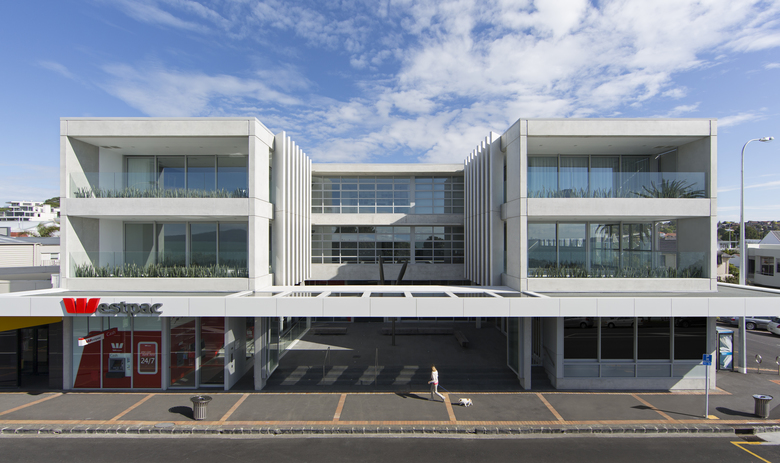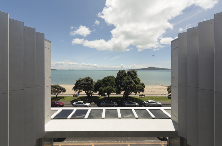 This mixed use development is located on a beachfront site in Auckland’s eastern suburbs, looking north up the Hauraki Gulf to the mouth of the Waitemata Harbour, the North Shore and Rangitoto Island. The building occupies a corner site over two parcels of land, 387 Tamaki Drive and 6 Maheke Street. The lower level of 387 Tamaki contains a bank, restaurant and the main building entry, around a publicly accessible courtyard, at the centre of which is a rotating sculpture known as ‘The Seedling’. These lower level spaces have been raised 0.5 metres above street level to allow views over parked cars to the beach and water beyond. The middle level of 387 Tamaki contains 5 commercial office suites, while the upper level houses 3 residential apartments that have their own private entry lobby on Maheke Street. The lower level of 6 Maheke contains parking for both buildings, services rooms and the entry lobby for the 2 full floor 3 bedroom residential apartments on the upper levels. The two upper levels have the same architectural expression, without differentiating commercial from residential uses, with the middle level capable of future residential conversion.