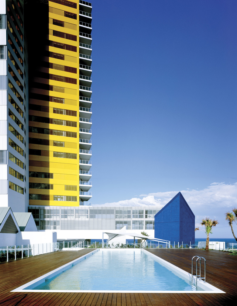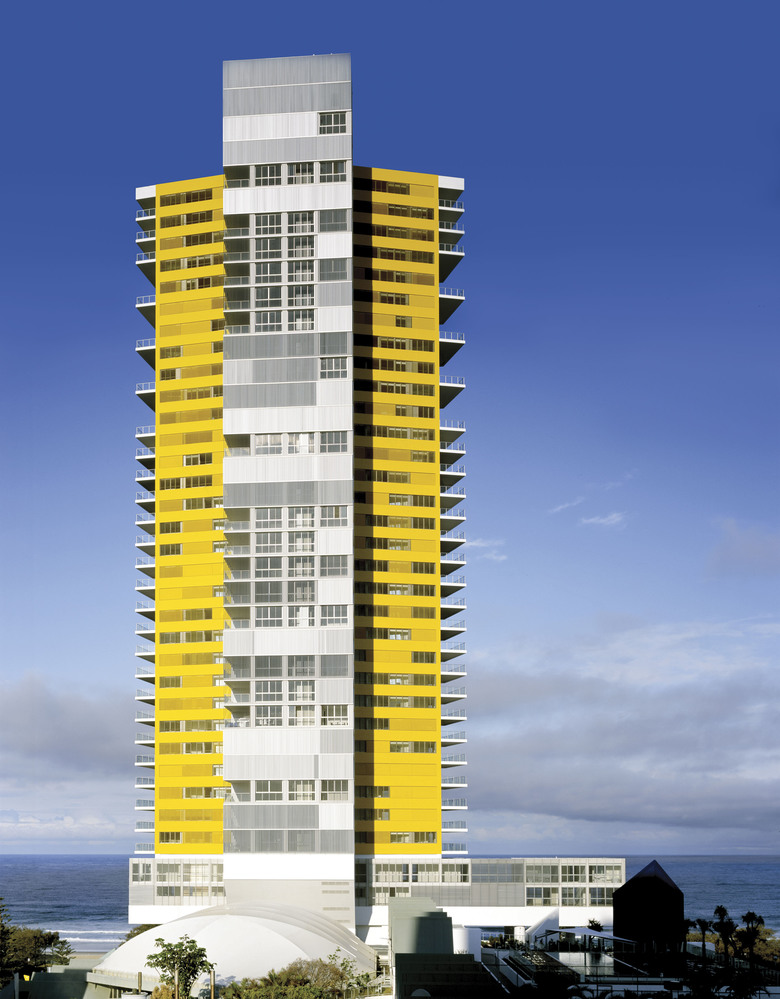 This 37 storey residential tower is located above the eastern end of the existing Oasis shopping centre at Broadbeach on Queensland’s Gold Coast. The building is centred over the existing monorail turning circle and is directly linked to the monorail station at level 3 of the shopping centre. The residential tower contains 134 apartments, a gymnasium/health club and landscaped gardens incorporating swimming pools and a tennis court on the roof of the shopping centre.