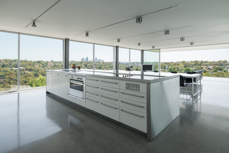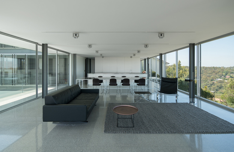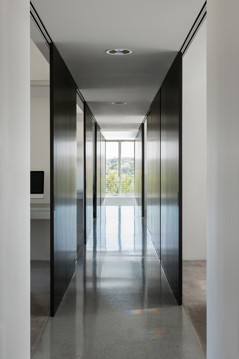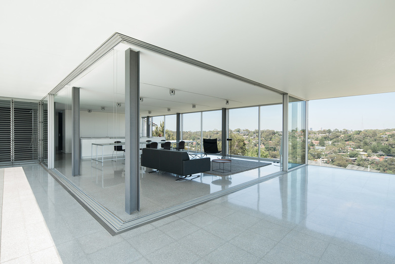 The site falls steeply to the west and north west, allowing uninterrupted views over the surrounding houses, with a large terrace opening off the main living area, cantilevered over the hillside. The lower level contains a guest bedroom, gymnasium, laundry and family room, that opens to the pool terrace. The upper level contains twin garages, 3 bedrooms, study, bathrooms, TV room and open plan kitchen, dining and living area. A central corridor runs through the house from the recessed front door to the top of the stair, with a series of fixed and sliding wall panels opening to rooms either side. Two north west facing sawtooth clerestory windows allow light and ventilation to the bedrooms and bathrooms. Terrazzo tiles are used on the corridor, bathroom and living area floors, as well as the external terrace, while carpet is installed in bedrooms and TV room.