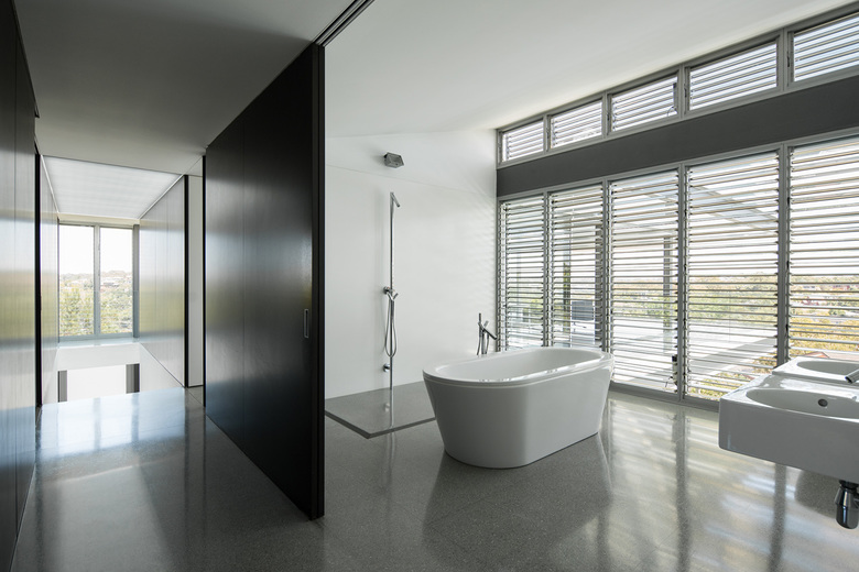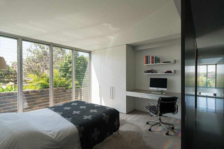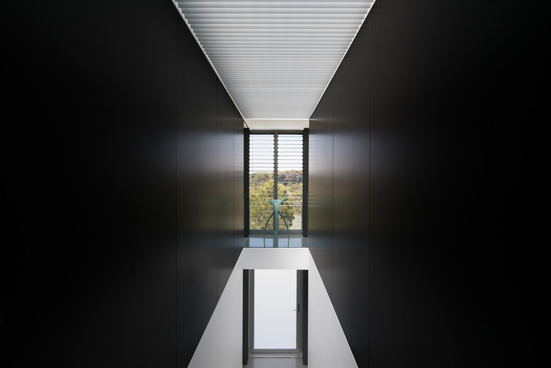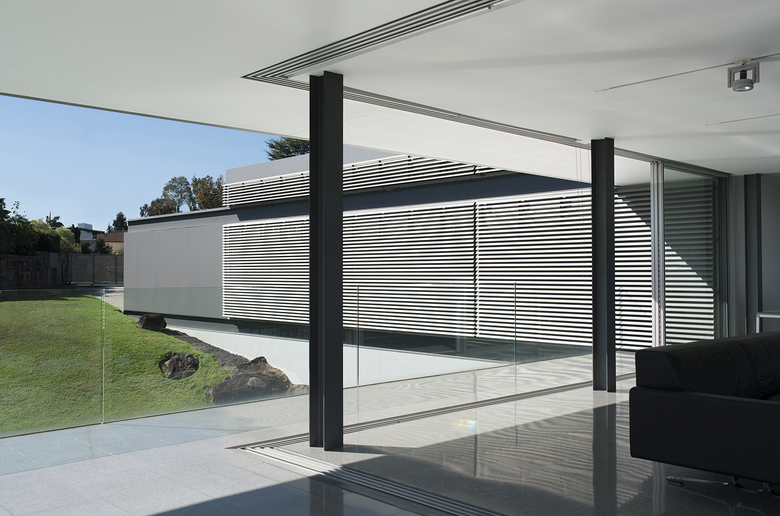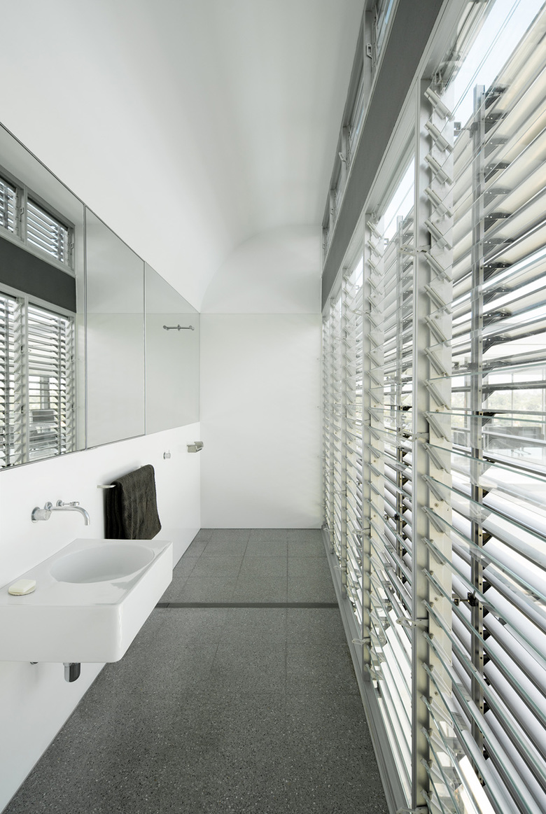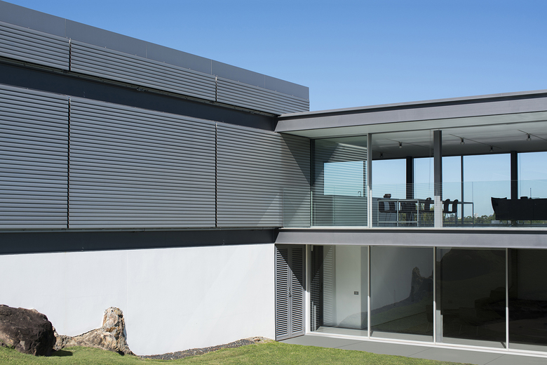 The exterior of the house is clad in composite aluminium panels and horizontal aluminium louvres for privacy and sun shading. These materials express the new steel framed portions of the house, while the original brick base has been rendered and painted white. The new steel beams are expressed to emphasise the strong horizontal form of the lightweight upper level, supported off a solid masonry base. The house is built on a sandstone rock ledge, which is clearly visible where it projects beyond the building footprint.