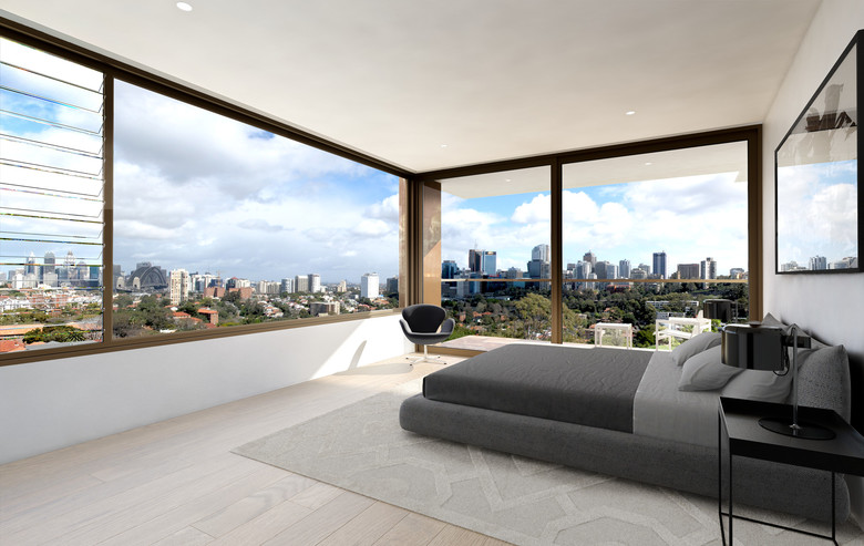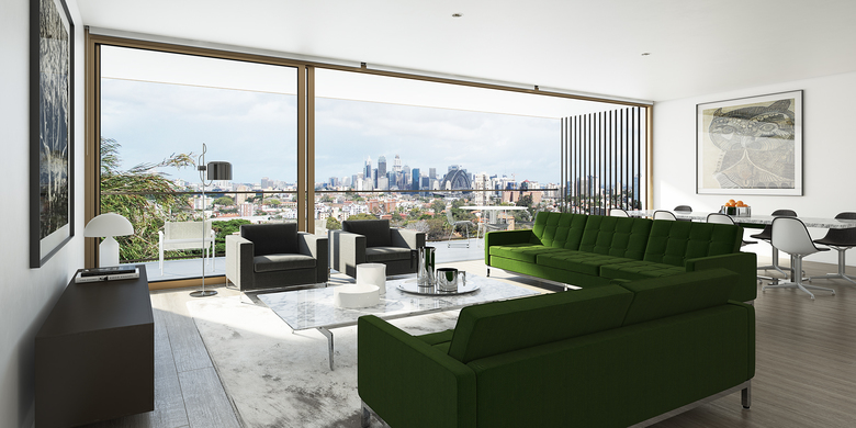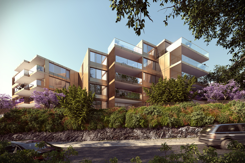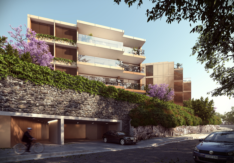 Two irregular shaped, steeply sloping sites have been amalgamated for this 13 unit residential development, however the local Council were insistent that there must be two separate buildings on the site to reflect the original development patterns in the area. The southern building has five levels, containing nine three bedroom units, with iconic views of the Sydney Harbour Bridge and CBD, while the northern building has four levels, containing four three bedroom units, with westerly views over North Sydney.