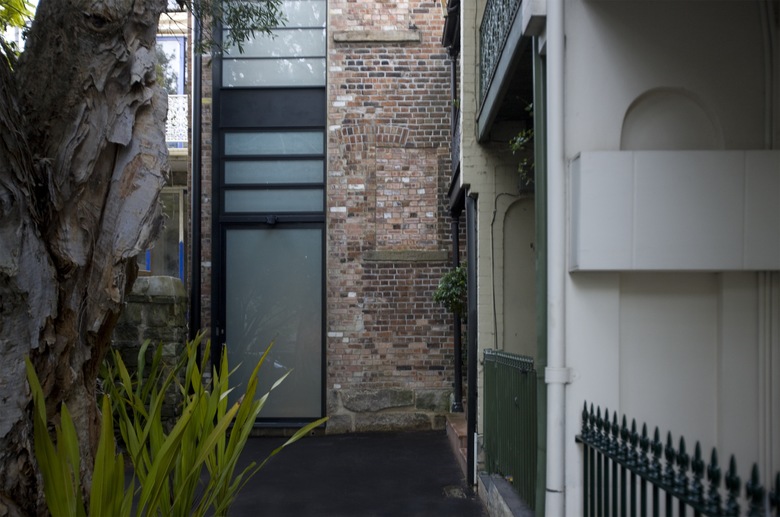 The property has 2 street frontages, allowing clear separation of pedestrian and vehicle entries. The new front door is located in the former loading dock at the end of a quiet cul-de-sac, adjacent to a heritage listed sandstone wall. The entry is defined by a full height steel plate portal, adding to the palimpsest of former window openings and recycled brickwork that make up this façade.