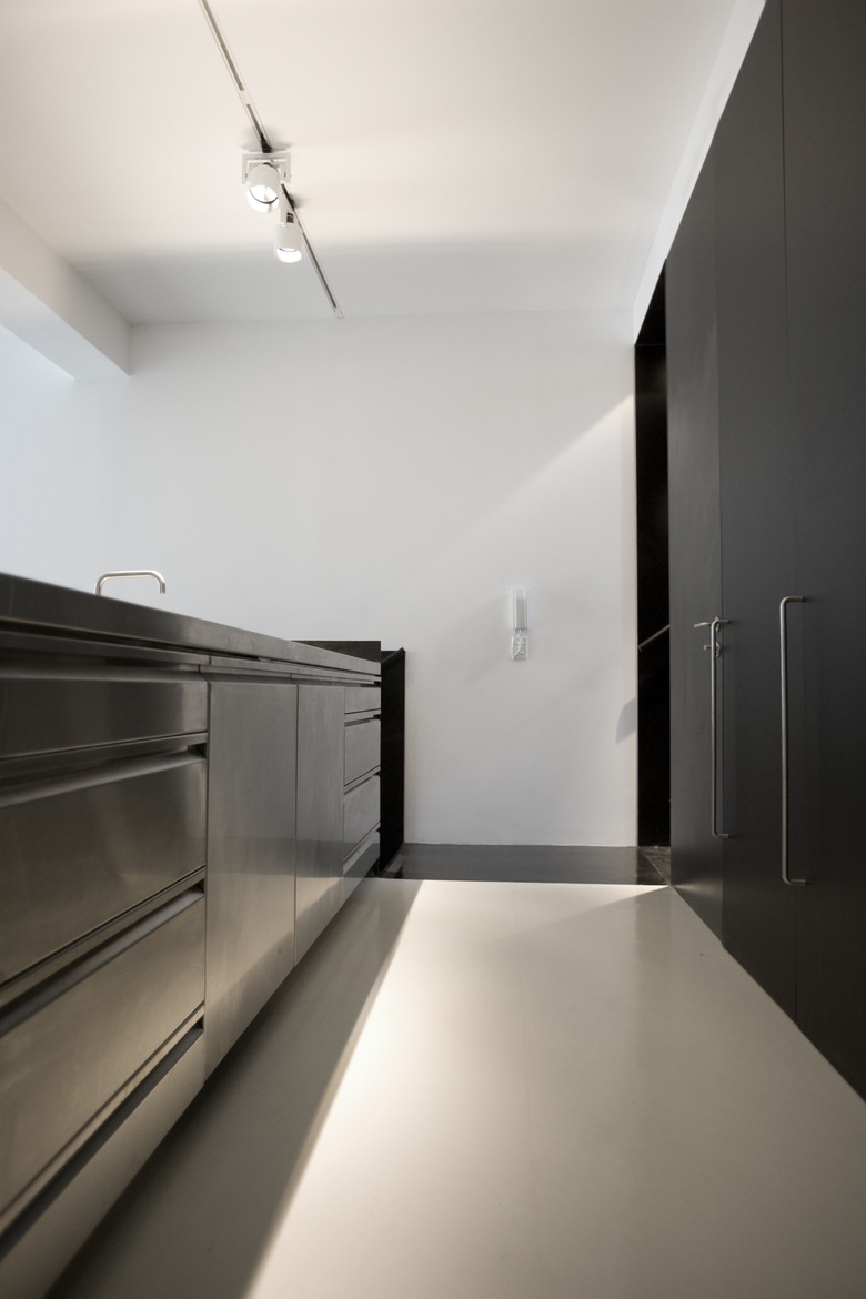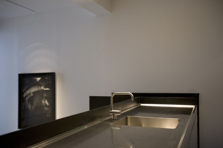 All existing structure has been retained, lined and painted white, while all new elements are painted black. This concept is carried through to the black and white rubber flooring. All joinery is finished in black anodised aluminium, including the bathroom on the upper level, which maintains the datum established by the height of the original window openings. The clear glazing above allows light from the new clerestory window to illuminate the formerly dark centre of the deep open planned space. Internally the bathroom is lined with Corian on both walls and floor.