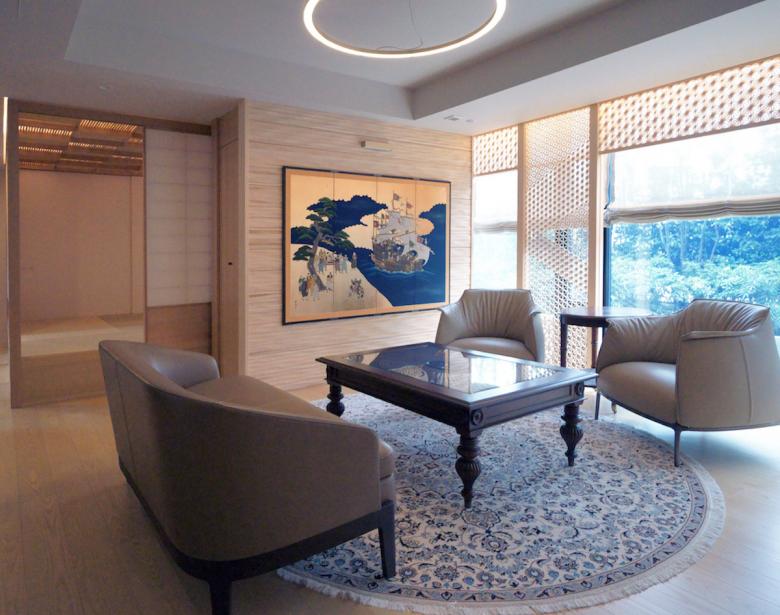 低層マンションのインテリア改修。空と緑を感じつつ、周辺建物に対する徹底的な視線の制御を目的に、調度品との完璧な調和を目指しつつ、組子パネルとテキスタイルによる多層のスクリーンを設え、くつろぎの場を構築した。