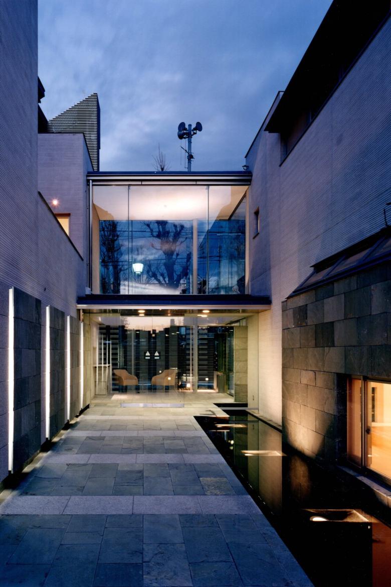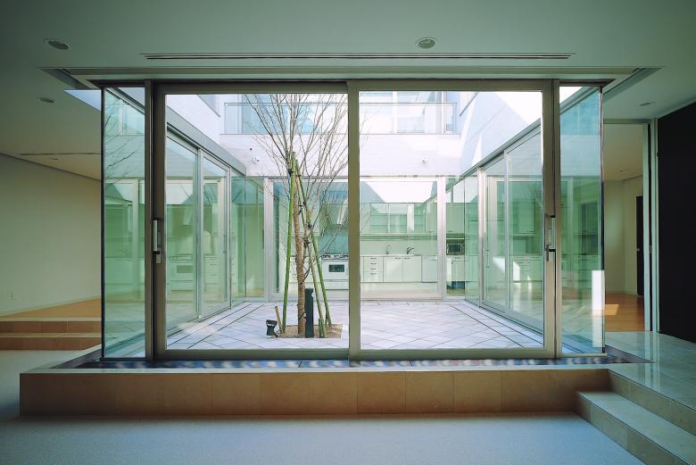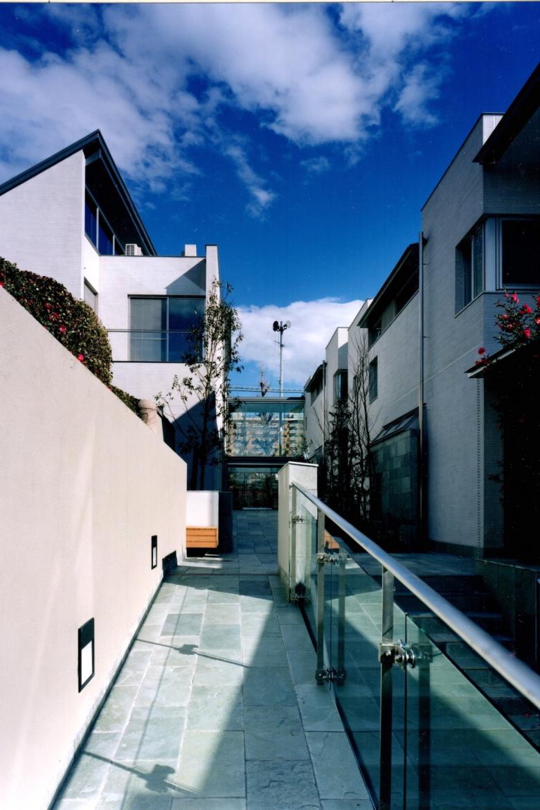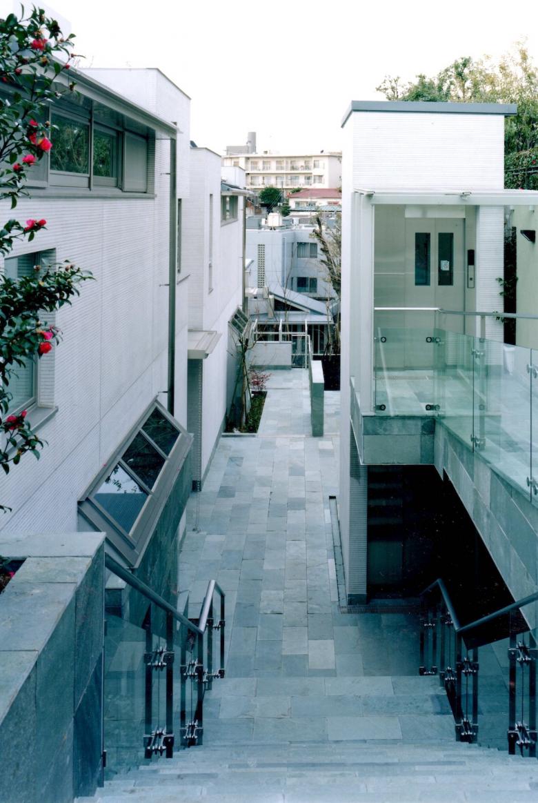 東西に90m、高低差13mに渡る敷地において、立体的に連続するテラスハウス構成と、道路から見て奥側にある住戸へのプローチとなる路地空間〜パサージュをガーデンと見立てた潤沢な共有空間、さらに断面構成の工夫によりエントランスや駐車場を計画した集合住宅。各住戸は、構造形式の検討により室内外が一体的に捉えられる中庭形式としている。