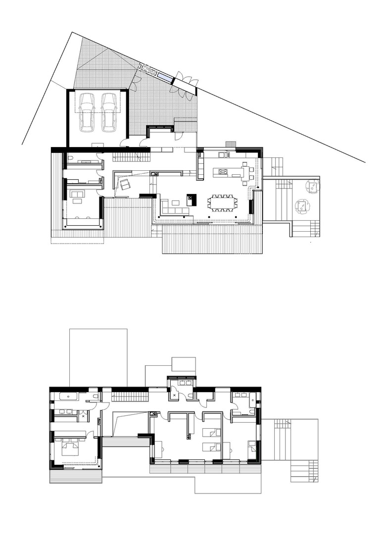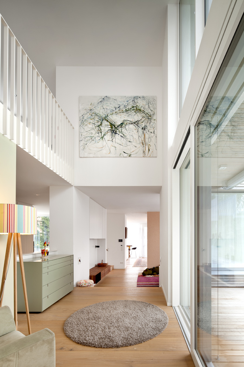 Das Erdgeschoß besteht in erster Linie aus einem großen Raum mit Zonen fürs Kochen, Essen und Wohnen. Dieser gemeinsame Wohnraum steht durch großflächige Verglasungen in enger Verbindung zu den Terassen- und Gartenflächen. Im Erdgeschoß finden sich zusätzlich noch ein Wirtschafts- und ein Büroraum. Im Obergeschoß befinden sich die Rückzugsorte, wie Schlaf- und Badezimmer.