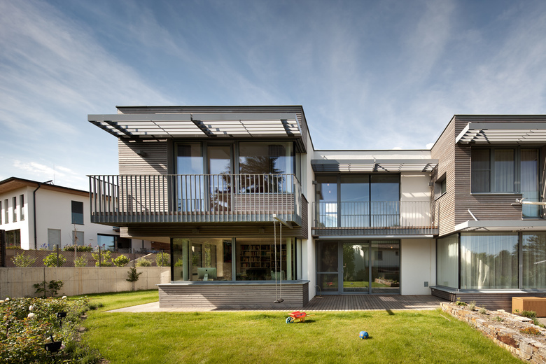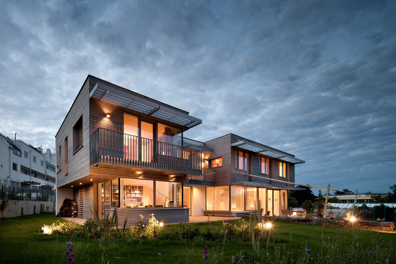 Wunsch der Bauherren war ein Haus für die 5-köpfige Familie in dem der Garten und die Jahreszeiten integriert werden. Daher wurde das Gebäude nicht parallel zur Grundstücksgrenze, sondern nach der Sonne ausgerichtet positioniert. Morgensonne, in der Küche und einigen Schlafräumen, Sonne den ganzen Tag in den Haupträumen und Abendsonne in ausgewählten Bereichen. Auch die im Keller befindlichen Aufenthaltsräume sollten Tageslicht bekommen, daher wurde die Höhenlage so gewählt, dass durch die Geländemodellierung an der Ostseite ein Lichthof entstand.