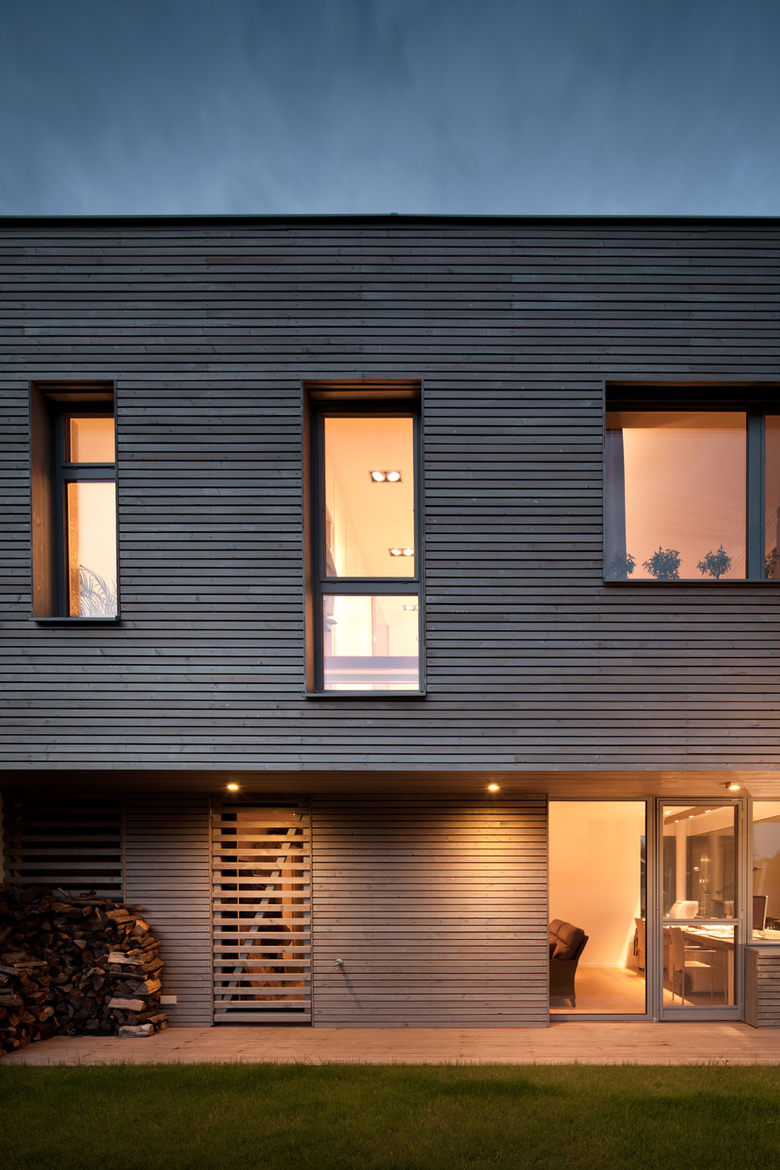 Die Nordwand wurde in verputzter Massivbauweise, die restlichen Außenwände als mehrschaliger Aufbau mit hinterlüfteter Holzfassade ausgeführt.