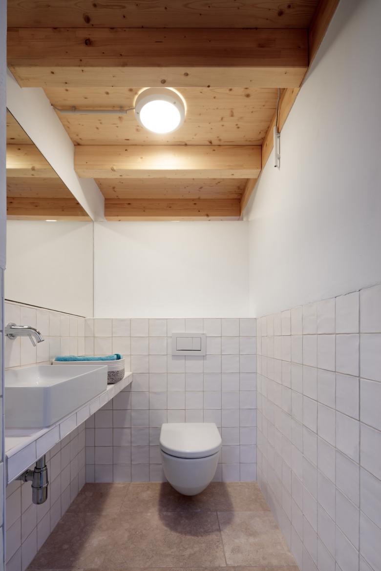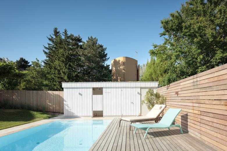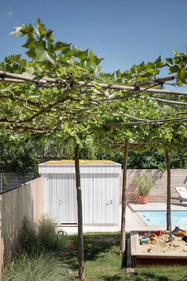 Das 1. Nebengebäude ist das Bindeglied Richtung Straße und zugleich auch die optische Abgrenzung. Es entsteht dadurch ein sichtgeschützter Bereich. Im Untergeschoß ist die Pooltechnik untergebracht. Im Obergeschoß die Wärmepumpe, ein großer Abstellraum für die Fahrräder, ein WC und eine Innendusche. Richtung Pool und Terrasse befindet sich am Nebengebäude eine Außendusche. Wand und Deckenkonstruktion ist ein Pfosten-Riegel-Konstruktion. Die Fassade wurde mit weiß lackierten Holzleisten ausgeführt, was dem gesamten Projekt eine luftige und leichte Anmutung gibt. Das Dach ist ein nach innen entwässerndes Gründach.