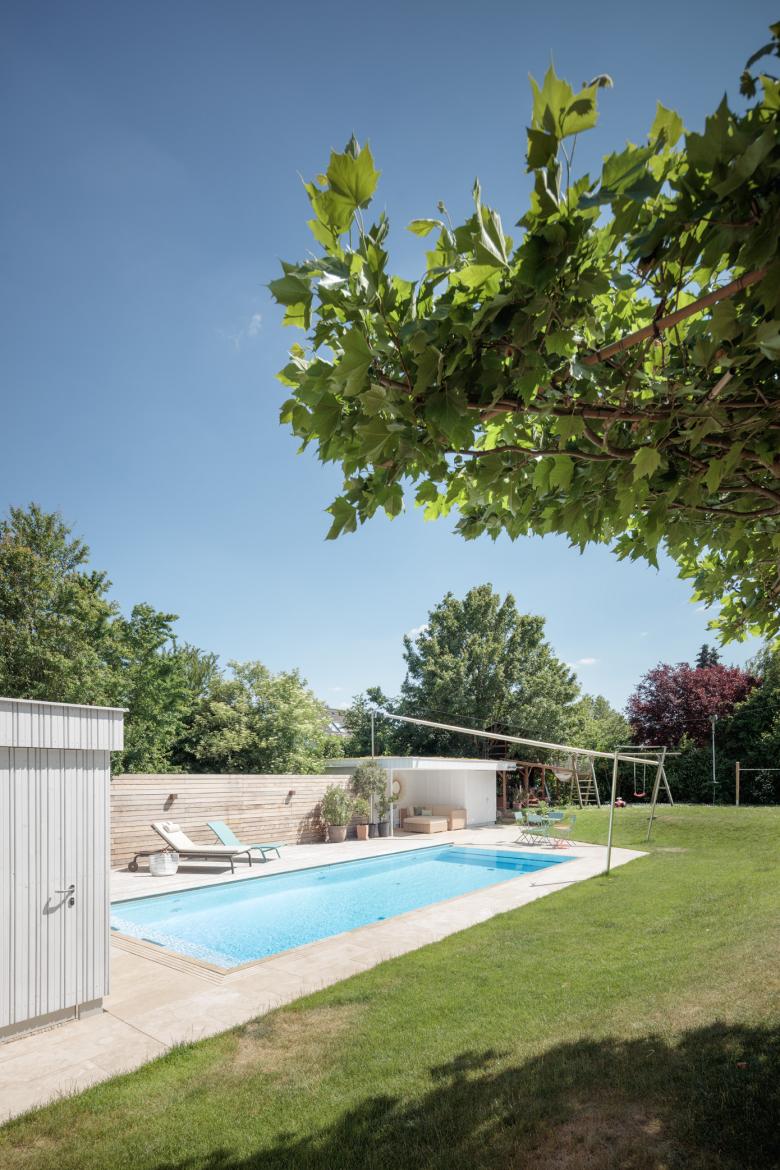 Da die 4 Kinder der Familie damals noch klein waren, wurde die Möglichkeit eines Pools zwar mitgeplant, der Pool aber erst später realisiert. Im Zuge der Planung im Jahr 2019 wurde die Positionierung überarbeitet und der Pool, anstatt an der Südseite des Hauses, an der östlichen Grundgrenze positioniert. Dadurch kam es zu einer völligen Neuordnung des Gartens.