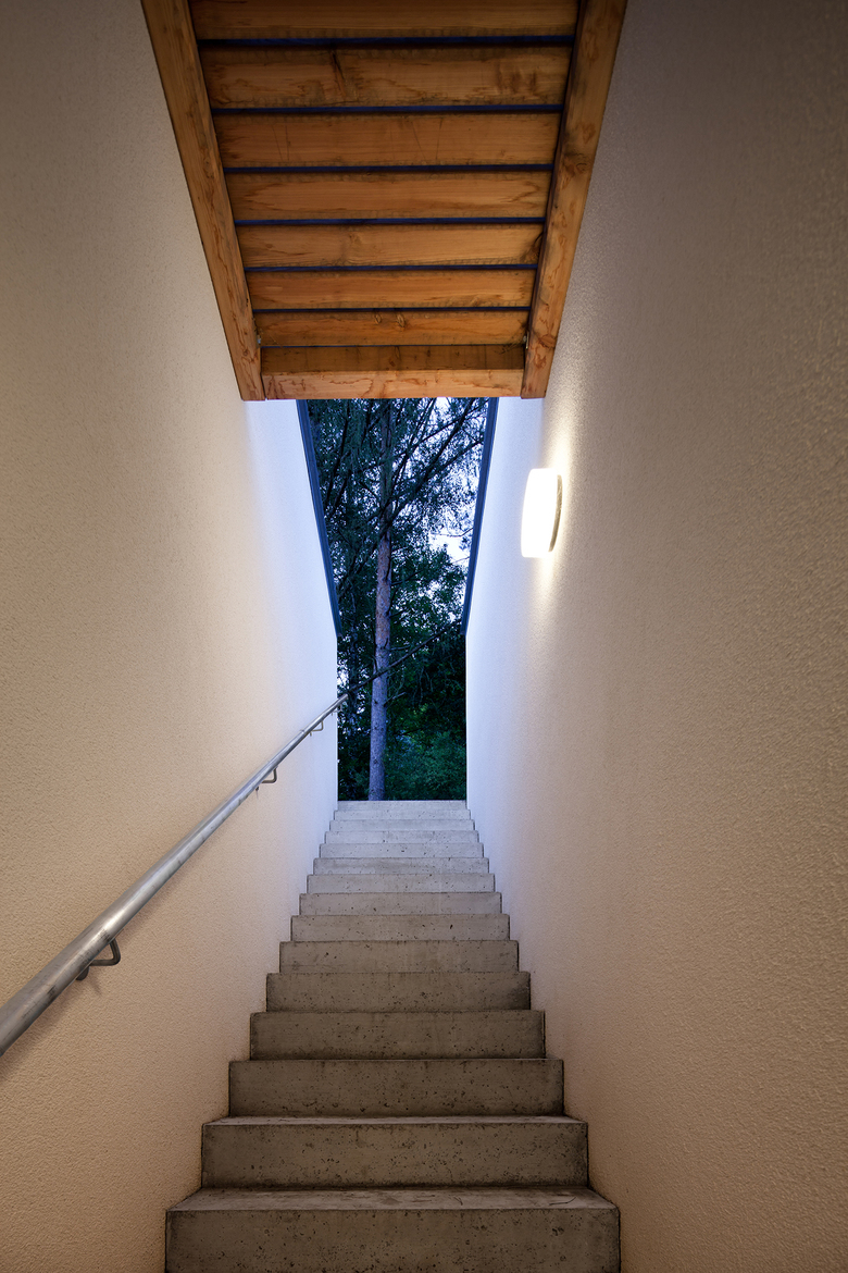Der Hinterausgang mit der Stiege auf das Gründach bzw. der neu geschaffenen ebenen Gartenfläche liegt an dem Kreuzungspunkt der „familienöffentlichen“ Fläche und der Privatsphäre der Eltern. Die beiden „Kinderzimmer für Erwachsene“ sind in einem großen Raum zusammengefasst, können aber mit einem Vorhang abgetrennt werden. Ganz im Osten schließt das Elternschlafzimmer an. Die Terrasse endet schon vorher um dem Bedürfnis nach Geborgenheit entgegen zu kommen.
