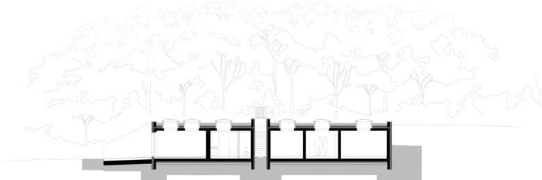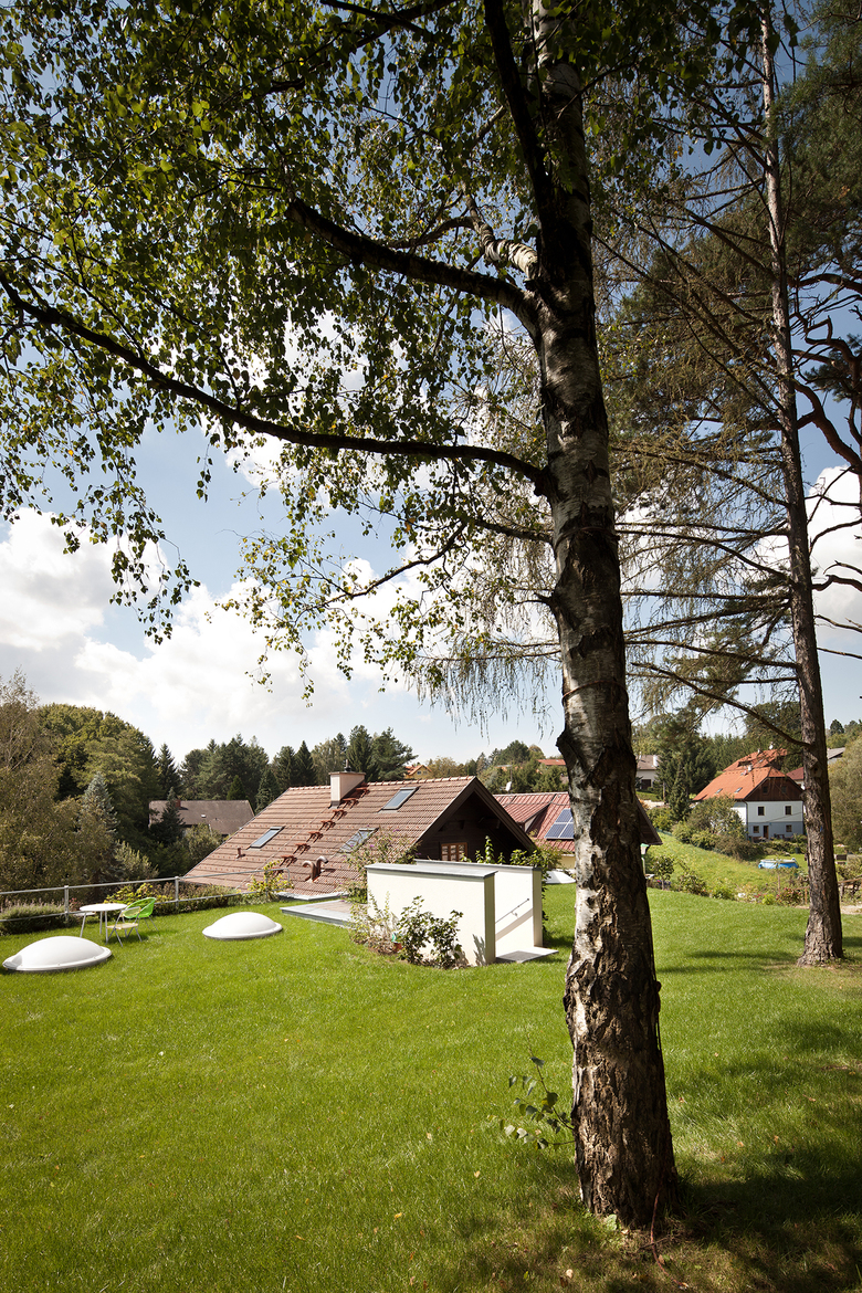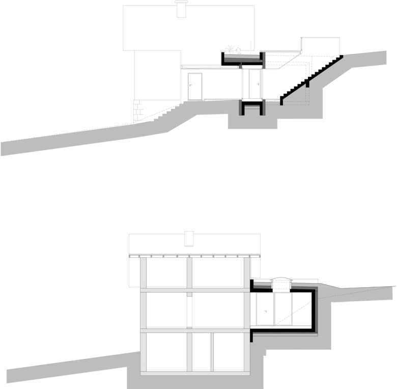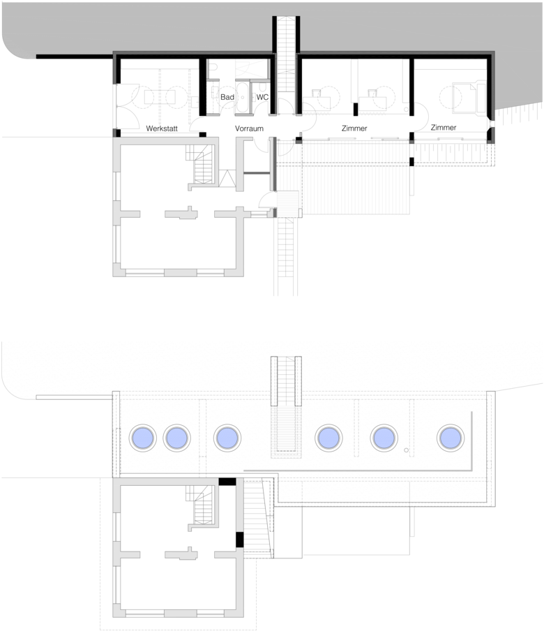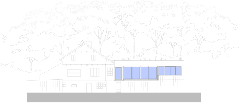 Der Zubau wurde nordöstlich des Bestandsgebäudes situiert. Es ist ein langgestrecktes, eingeschossiges Gebäude in Massivbauweise, welches in den Hang eingegraben wurde. Durch die Einschüttung des Zubaus und die Begrünung des Daches wurde erstmalig eine ebene Gartenfläche geschaffen. Belichtet wird der Zubau durch die vollständig verglaste Südfront welche durch das massive Vordach verschattet wird. Zusätzlich erfolgt eine Belichtung über runde Lichtkuppeln. Dadurch erhalten auch jene Bereiche Tageslicht, welche direkt hinter dem Bestand liegen, wie Badezimmer und Werkstatt. Der Bestand wurde im Erdgeschoß adaptiert um eine innenliegende Verbindung der beiden Bauteile zu ermöglichen. Eingangsbereich, WC und Bad wurden umorganisiert. Das neue Badezimmer und das WC liegen nun zentral gelegen im Zubau.