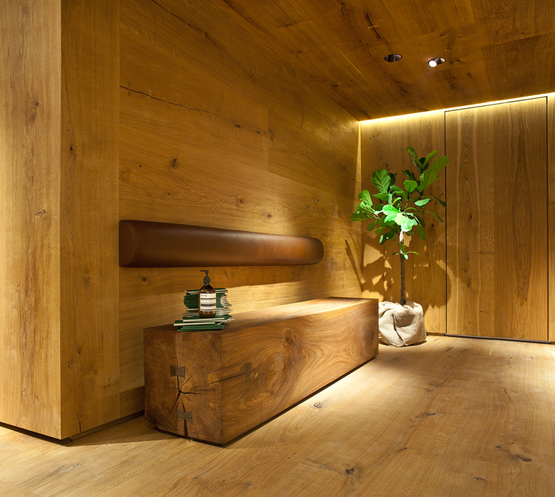 Old wood and plaster shapes a store space divided in two, the open and the intimate. The floor as well as the walls and roof of the inner space are Heart Oak from the Danish producer Dinesen. With reused elm tree timber from Djurgården in Stockholm and Järna (taken down since infected by the Dutch elm disease) we have together with wood artist Lies Marie Hoffman shaped three functional pieces the point-of-sale counter, sink and complementary bench. Lies- Marie works the wood using chainsaw and chisel and we have together formed a geometry that lifts the timber´s inner growth lines and reveals its unique beauty. Oak butterfly joints keep cracks together. All the wood is oiled to keep the tactility of the material intact.