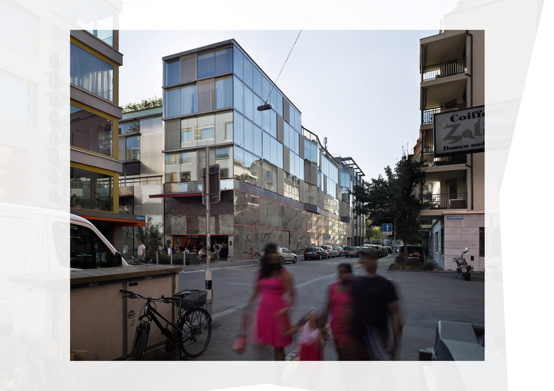 Eine Treppenserpentine aus rohem Walzstahl verbindet die Wohnungen mit den Bürolandschaften. Die pointillistische Siebbedruckung den Glasfassade mit einer tausendjährigen Eiche verleiht den einzelnen Arbeitsplätzen Diskretion zur Strasse und spielt als Rusticoornament auf den gründerzeitlichen Baustil der Quartiersockel an.