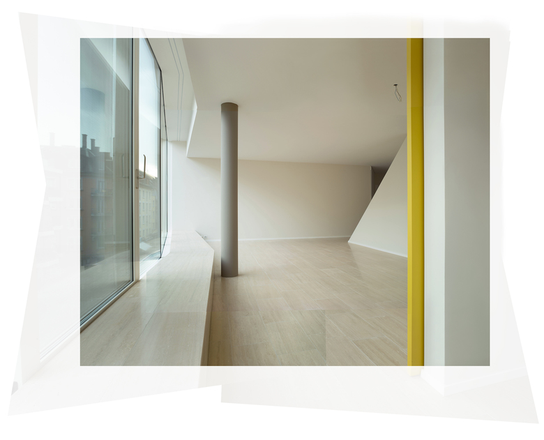 Das Gebäude, eine Ortbetonstruktur mit flexiblen Spannweiten, besteht aus einem Sockel mit Büroraumen der SVA, privater Bar, grosszügigem Wohnentrée, Separée mit Büroeingang sowie einer Hofdurchfahrt mit Schaufenster. Darüber liegt der Aufbau mit 22 individuellen Wohnungen, deren Zimmer zum Hof orientiert sind und von seiner Intimität, Ruhe, Luft und Mikroklima profitieren: Von Seilen wächst ein artenreicher Pflanzenvorhang, der die Fauna und Flora des benachbarten Bahnfelds aufnimmt und erweitert. Die Wohnräume zur Strasse erhalten weiches Nordlicht und ihre Erker und Fensterbänke geben Ausblick ins Quartier.